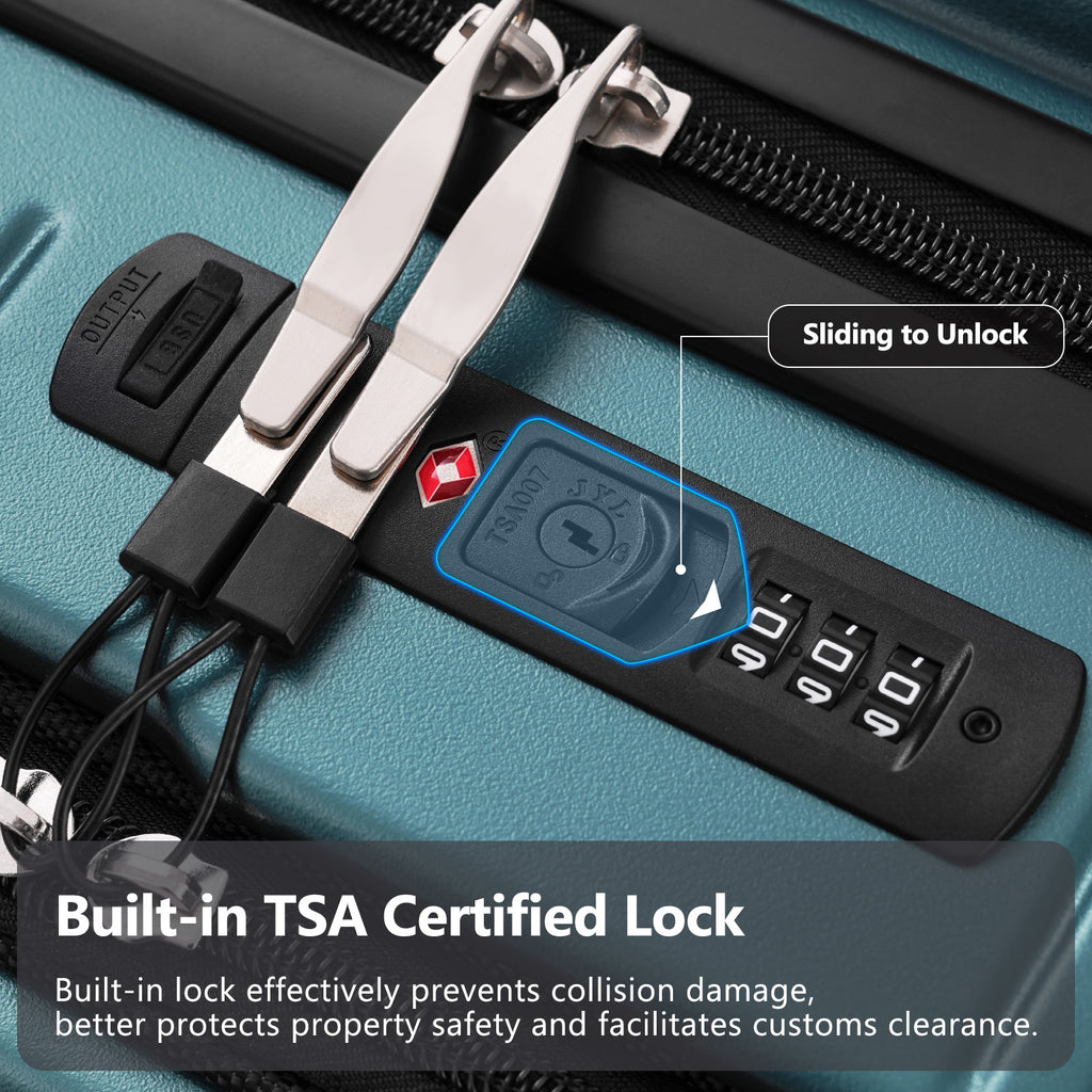 - Carry-on luggage comes with a 3-dial TSA approved lock for security. TSA lock with USB charging port(power bank not included), so you can charge mobile device on the go.