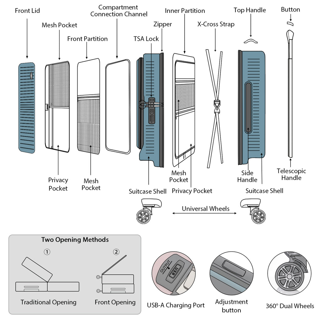 - The front pocket compartment can be opened for easy access to personal items and electronic devices while on the go. Compared to traditional luggage, this suitcase can be opened from front compartment to main compartment, making it convenient for you to use in any tight space.