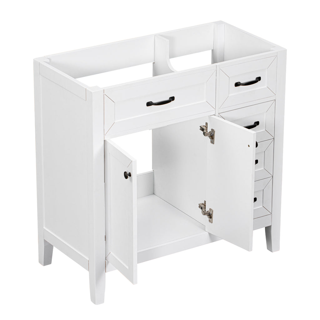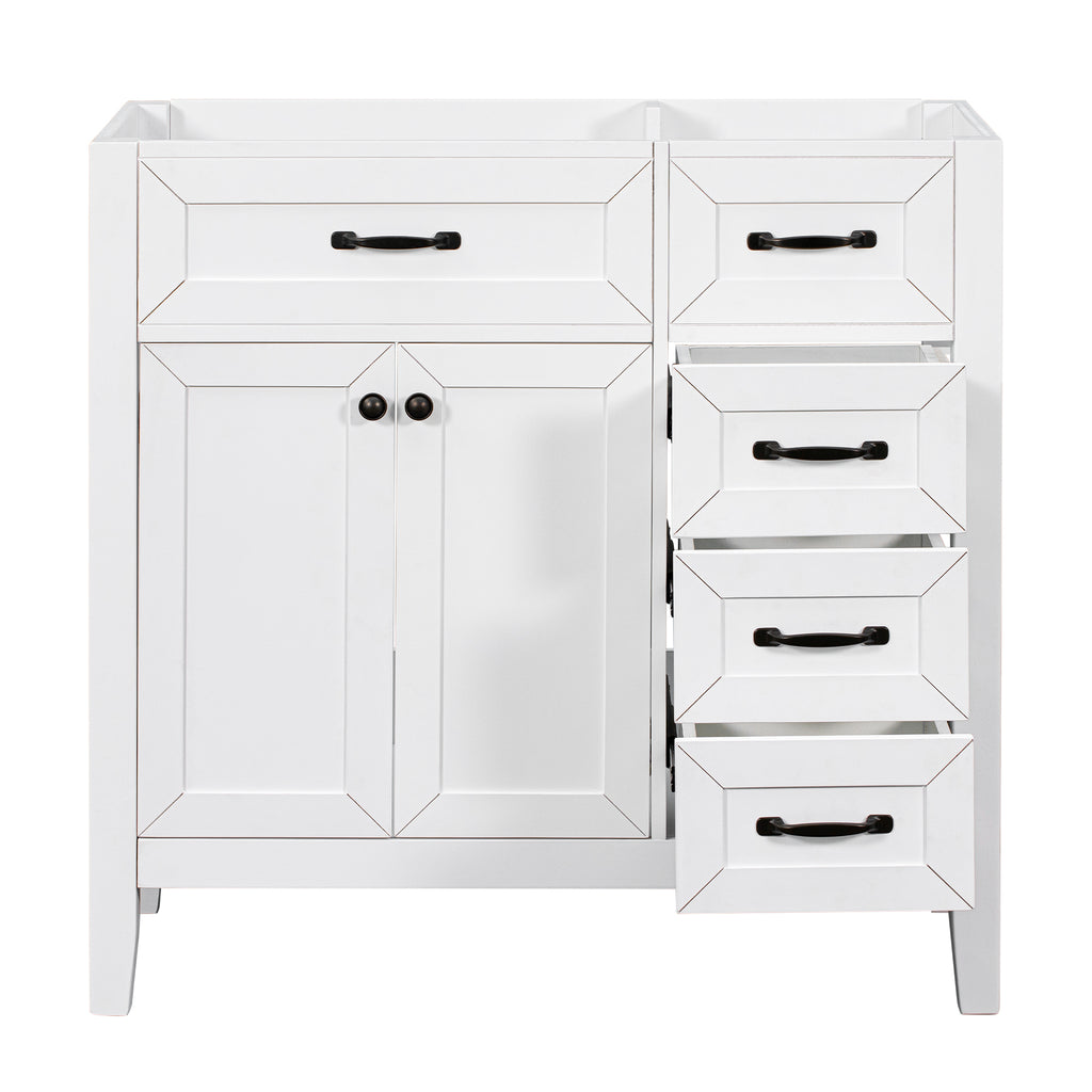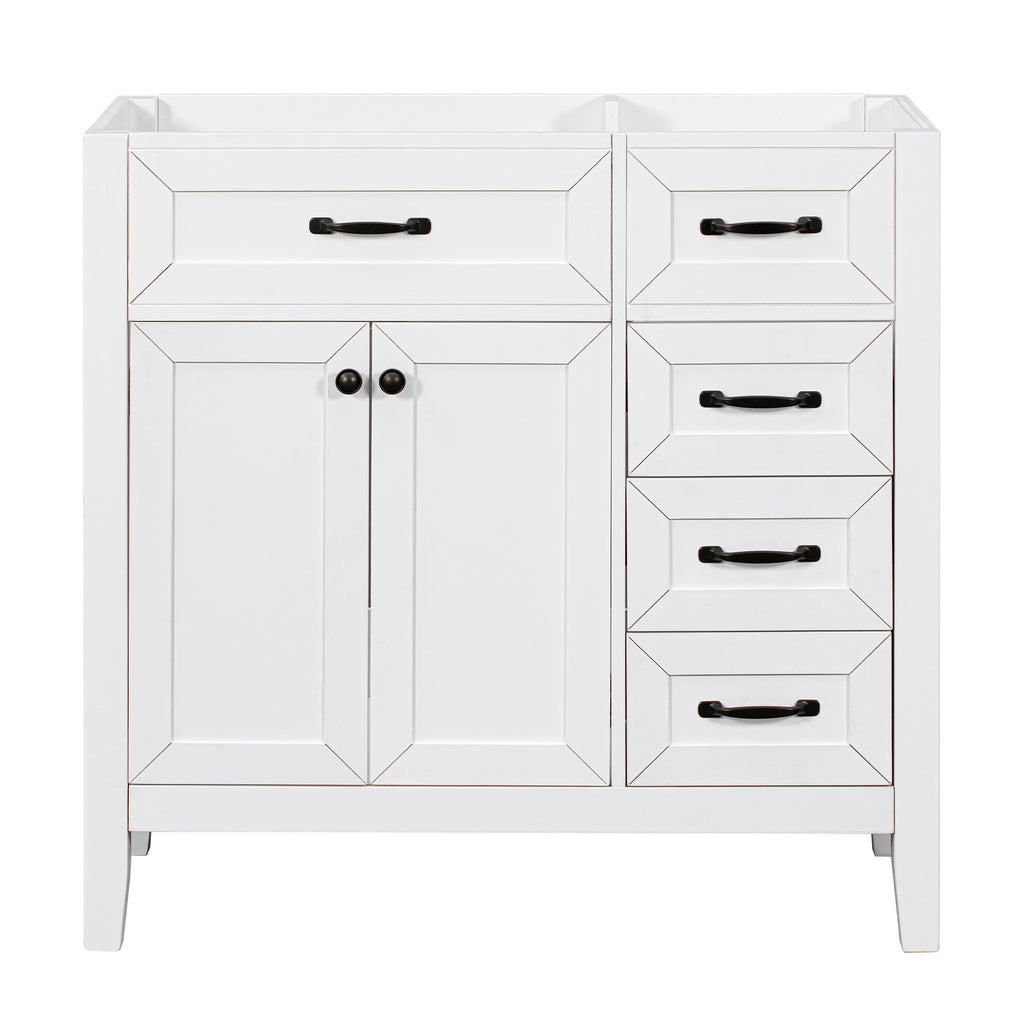 - Stylish 36' Bathroom Vanity Base Only: This 36' bathroom vanity is suitable for bathroom in any decoration style. Freestanding white vanity cabinet with black handles complies with your bathroom facilities. The groove design on the door and drawer increases the artistry and aesthetics of the home environment. If you're looking for a simple but stylish bathroom sink vanity, our product will be a great choice to upgrade your bathroom.