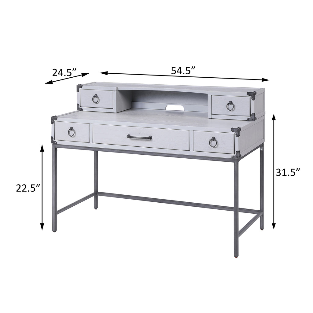 Elevate your workspace with this industrial-style writing desk, boasting a sleek grey and gunmetal finish that exudes urban sophistication. With three spacious drawers for organizing office supplies and papers, its versatile design fits seamlessly into home offices, study areas, or functions as a stylish console table, supported by sturdy metal straight legs/base crafted from pine and poplar for both strength and visual appeal.