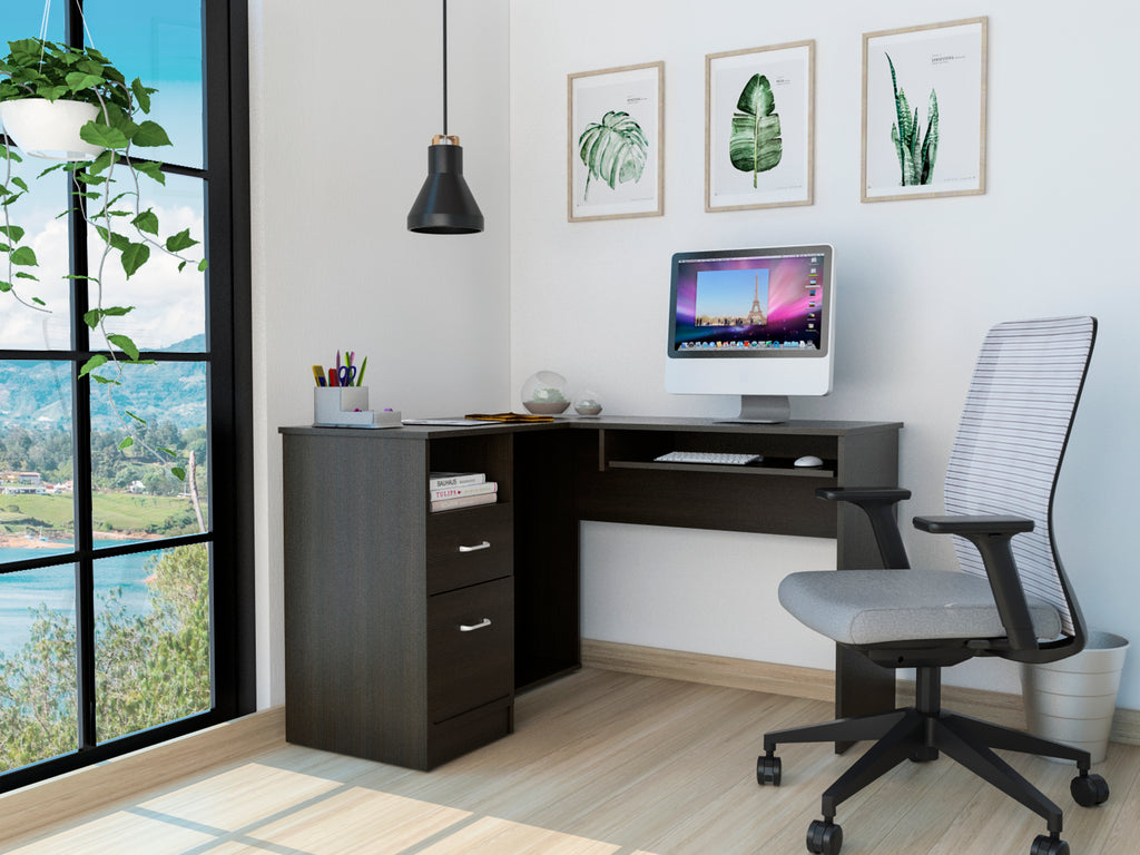 This desk features an L-shaped top surface on one side and on the other, providing ample workspace. It includes legroom, a top drawer, a bottom drawer and shelves for organized storage.