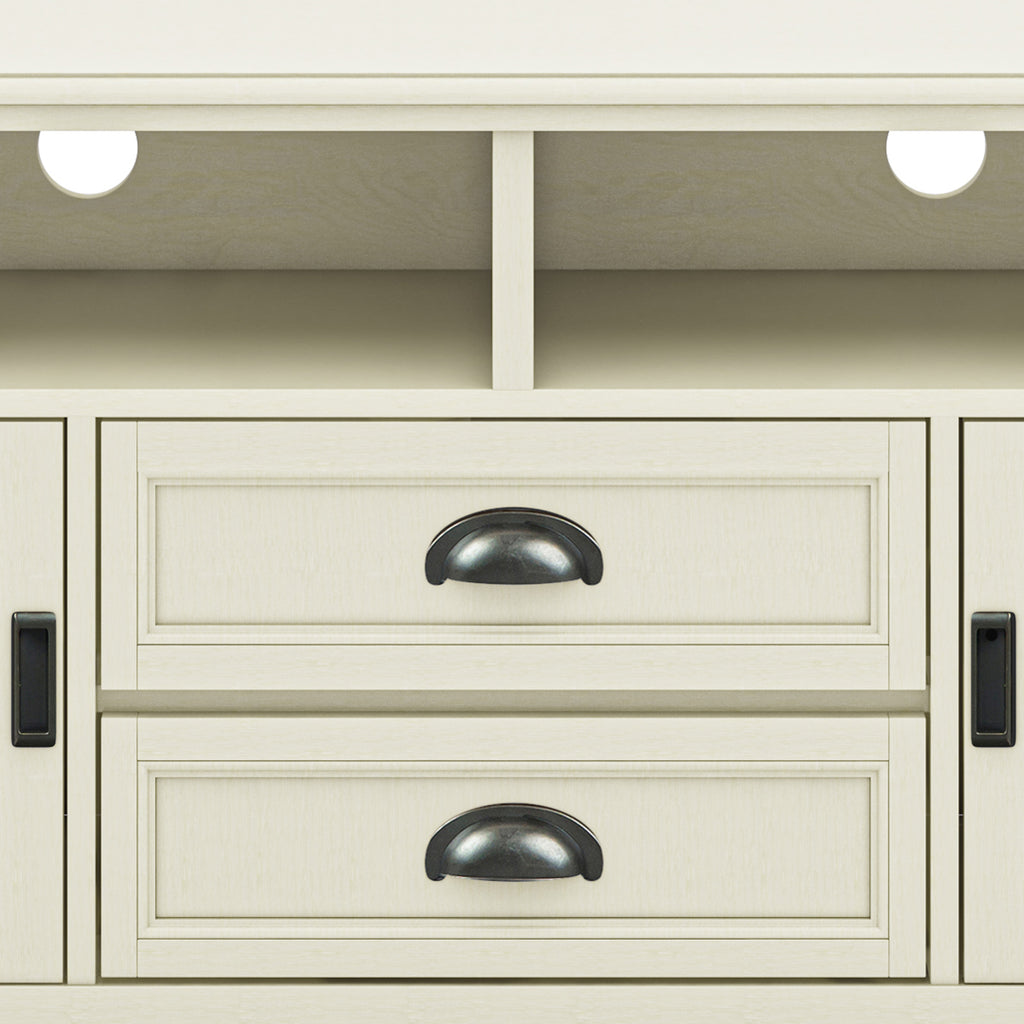 - Features two (2) centrally located open areas with two drawers as well as two (2) framed doors with enclosed spaces; the two (2) large side storage cabinets open to one adjustable shelf each.