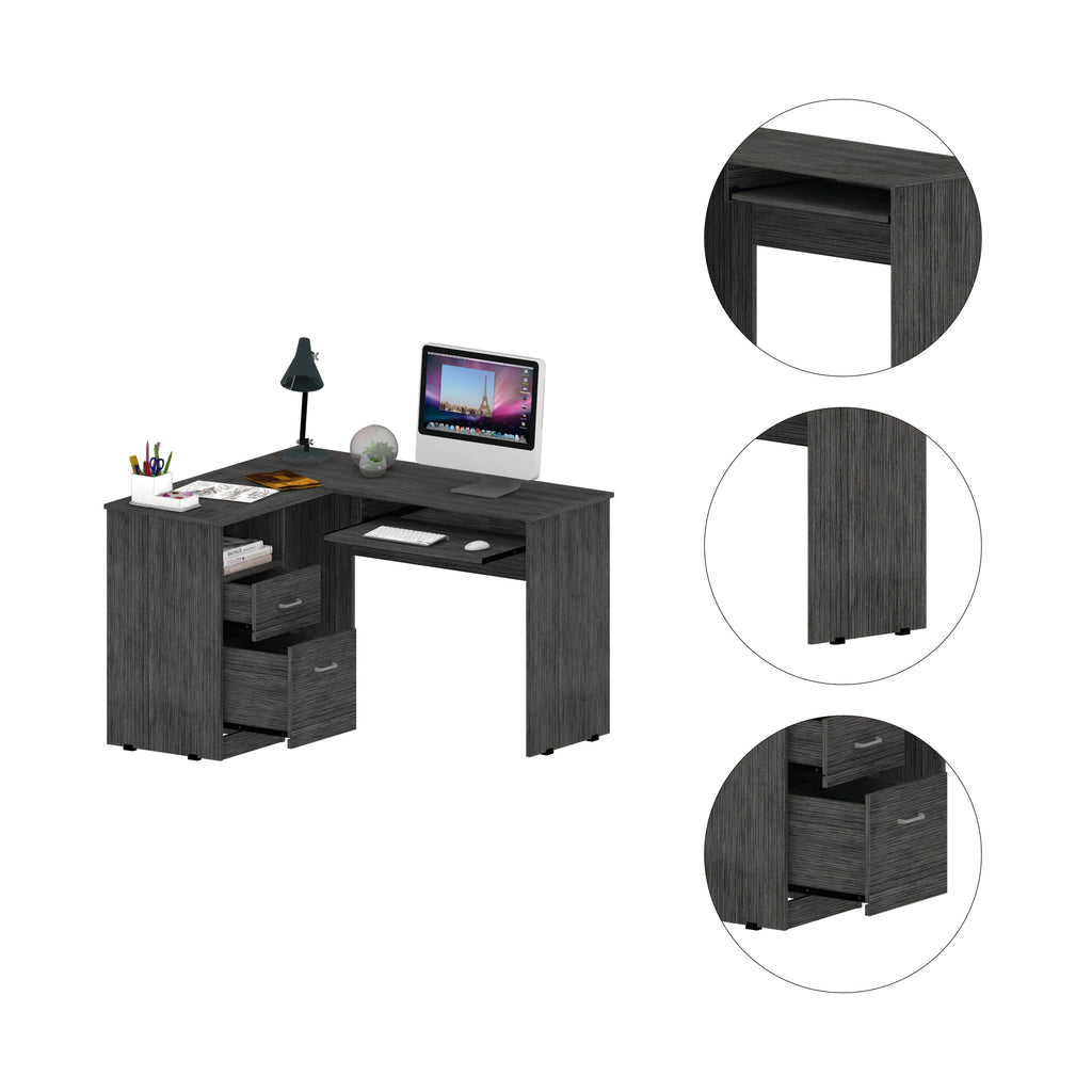 'This L-shaped office desk features ample storage and storage of accessories, a hefty load capacity, and a thick panel that makes the desk sturdy. It has easy access for your legs to store all your files, documents, laptop, consoles. Plus, underneath the desk, you will find plenty of space to keep your legs relaxed and place your CPU or other supplies. Its two drawers allow storage of lots of files, books, and more. It has an open shelf to keep the CPU protected, and most importantly, thinking about facilitating the use of the desk, it has a sliding shelf for keyboards, allowing you to hide your keyboard without taking up space on the main surface. The Raleigh Home Office Desk is an L-shaped computer corner desk that will be a stunning focal point in your contemporary home office. This simple and stylish piece features thick panels and clean lines. A slick design combining materials and different height surfaces will make this desk stand out. With an around L shape top surface