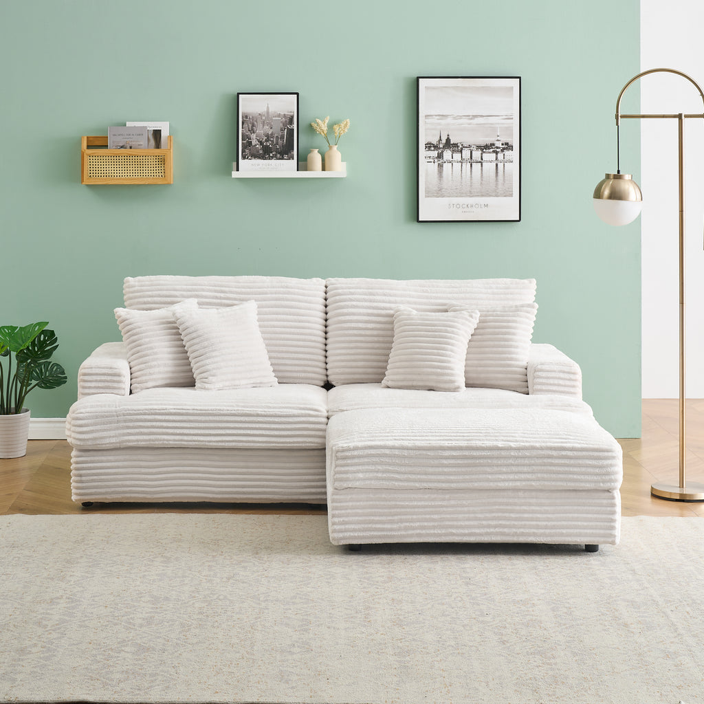 The fabric is made of high-quality white corduroy, which is delicate, lustrous and rich in texture. The exclusive single footstool can be moved freely and can instantly transform into an elegant chaise longue, allowing you to lounge around lazily. The footstool takes on the important task of storage, with a large-capacity storage space concealed underneath, serving as an ‘invisible shelter” for household odds and ends, thus making the living room tidier and more spacious.The backrest and the pillows are also wrapped in delicate white corduroy with short and dense fluff, providing a smooth hand feel. The interior is filled with high-quality doll cotton that is firm and plump.This white corduroy sofa combines soft texture, flexible design, powerful storage and considerate companionship. It is not just a sofa but also a warm support during tiring days and a capable assistant in daily trifles.