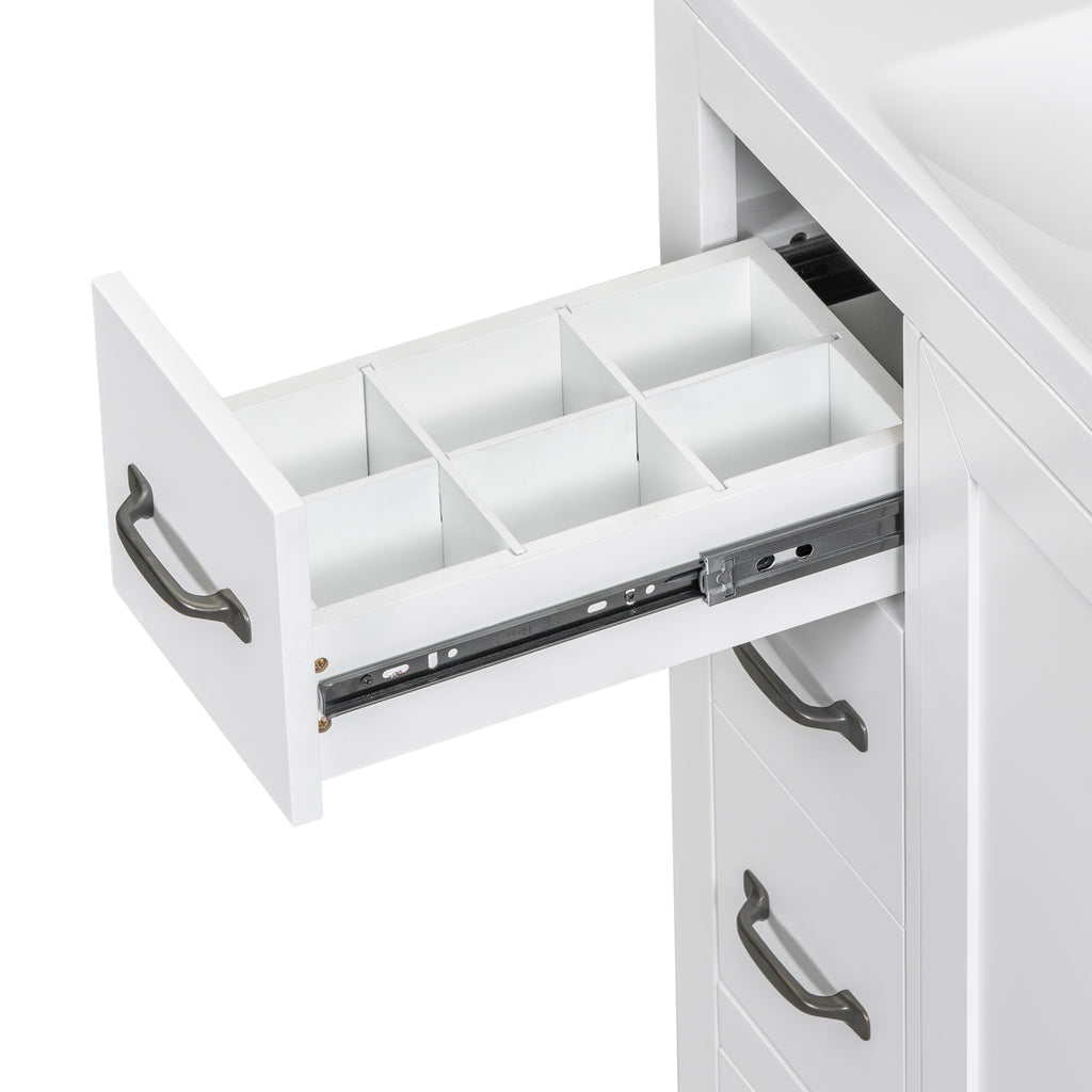 - Storage Space: This bathroom vanity has ample enclosed storage spaces: one cabinet with an adjustable shelf inside, and three drawers with slide rails each side. You can put soaps, towels, shampoos, tissue paper and other bathroom essentials in it so to keep them away from dust.
