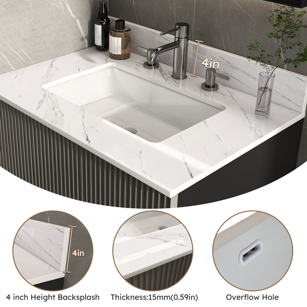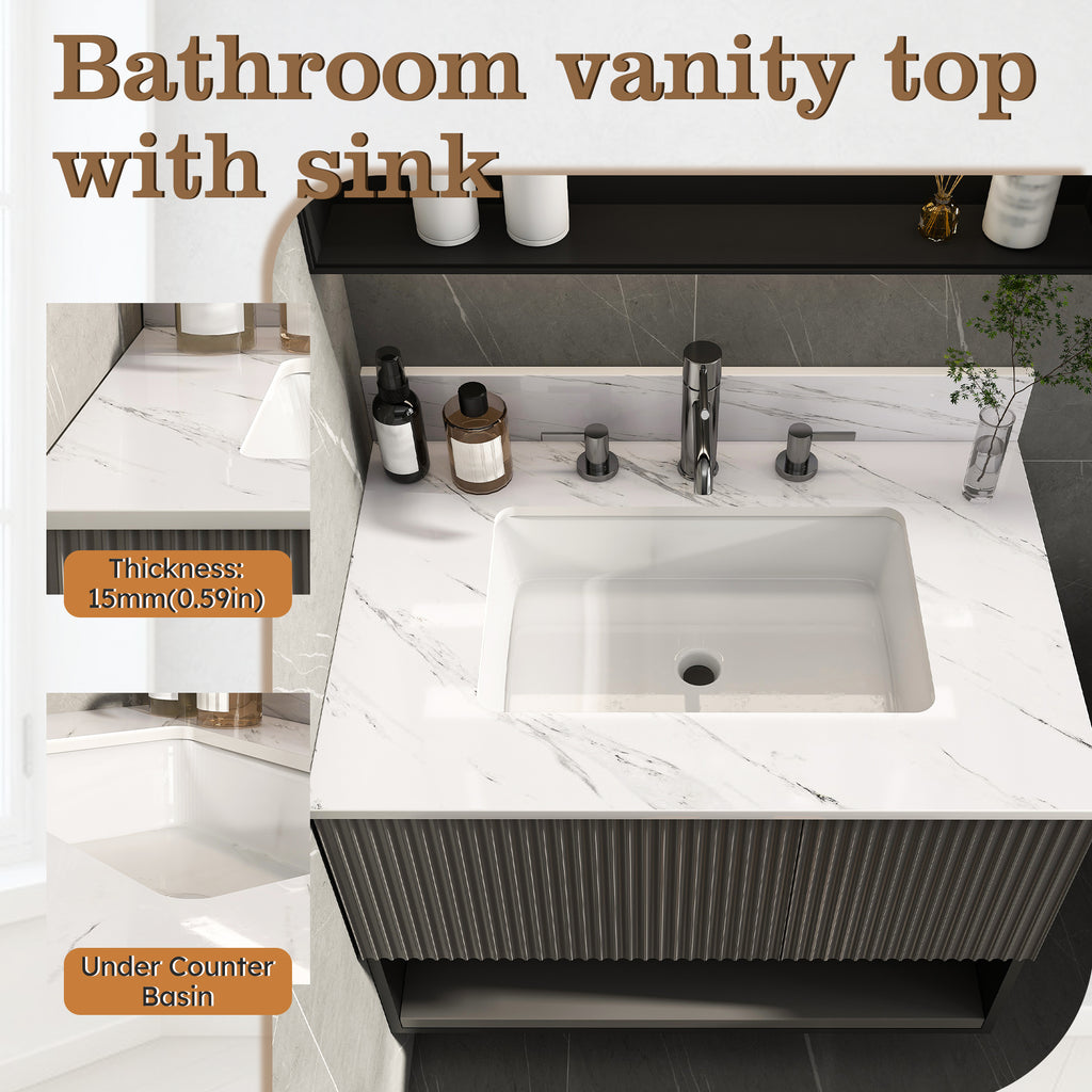 - Package Includes: vanity top with assembled rectangular ceramic sinks, 4' high backsplash. Besides, an extremely solid package - Reinforced packaging making sure a safe delivery. (Attention: Cabinet and faucet NOT INCLUDED).