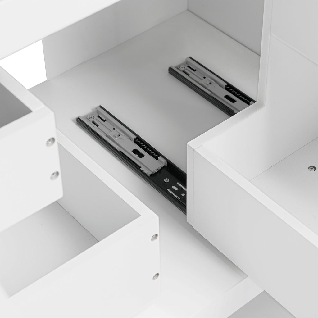 - Multi-functional Drawers: This vanity cabinet inside is designed as functional storage: two drawers with slides underneath can be pull out and in, which is convenient for you to take stuff. Moreover, each drawer has two up and down parts to place necessities in different size.
