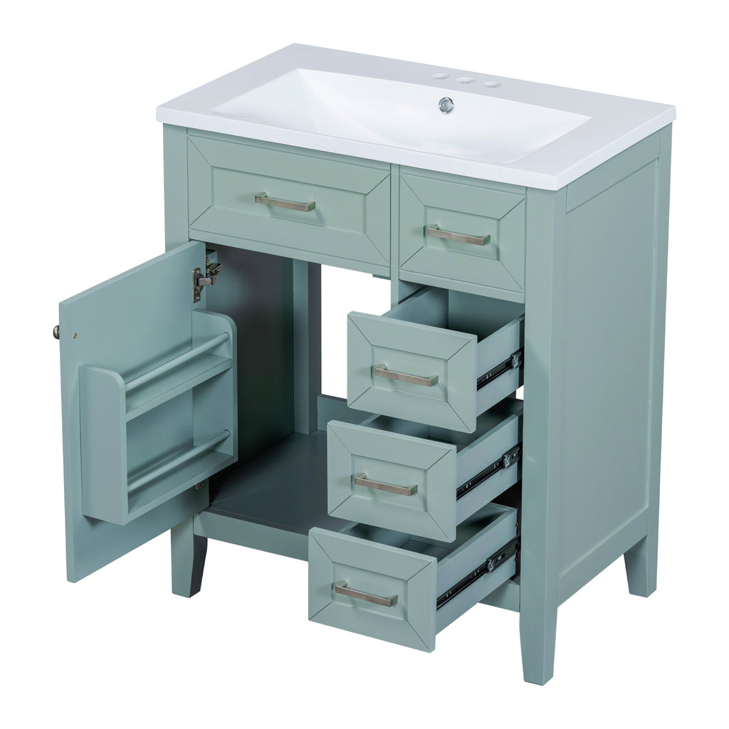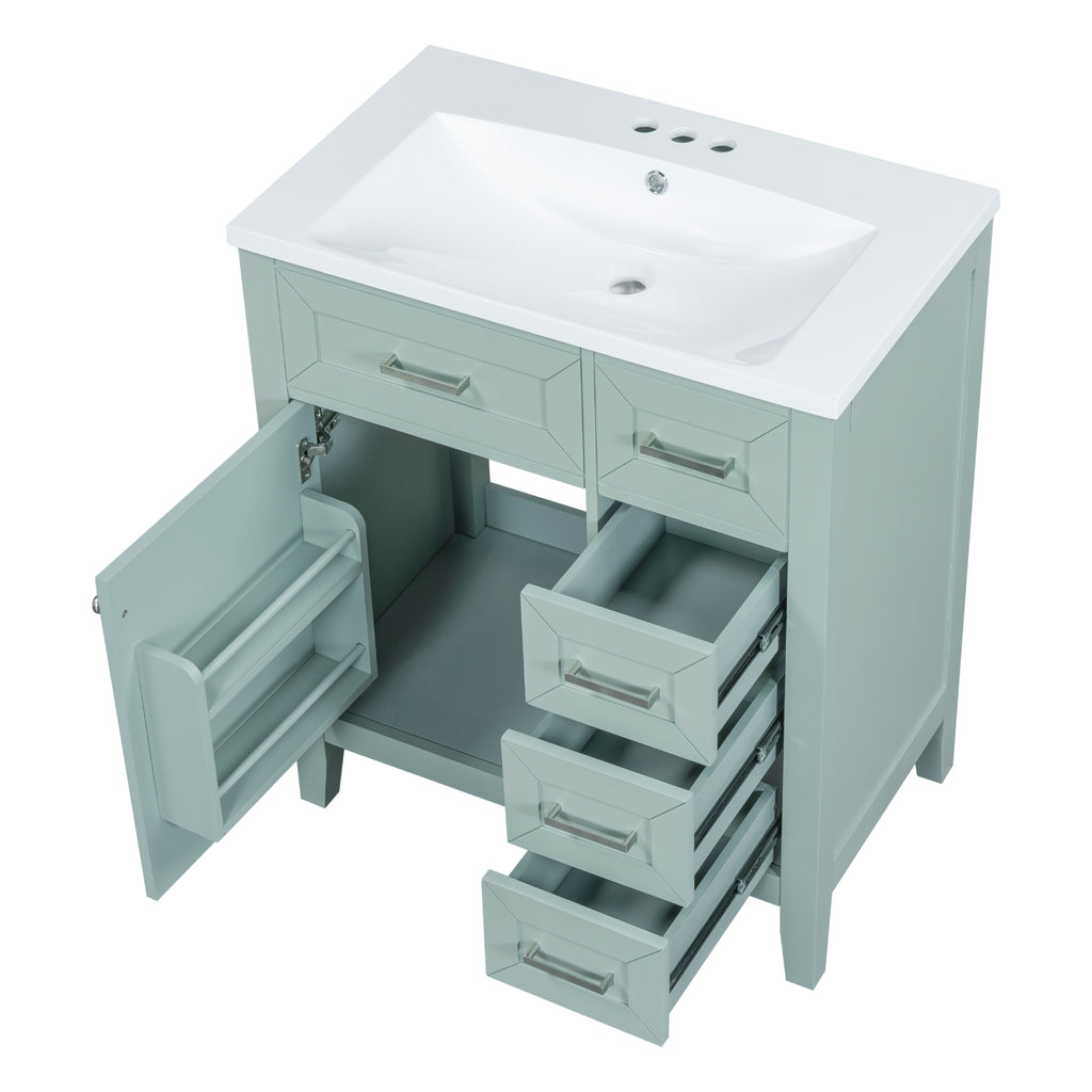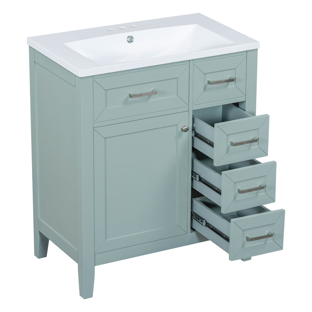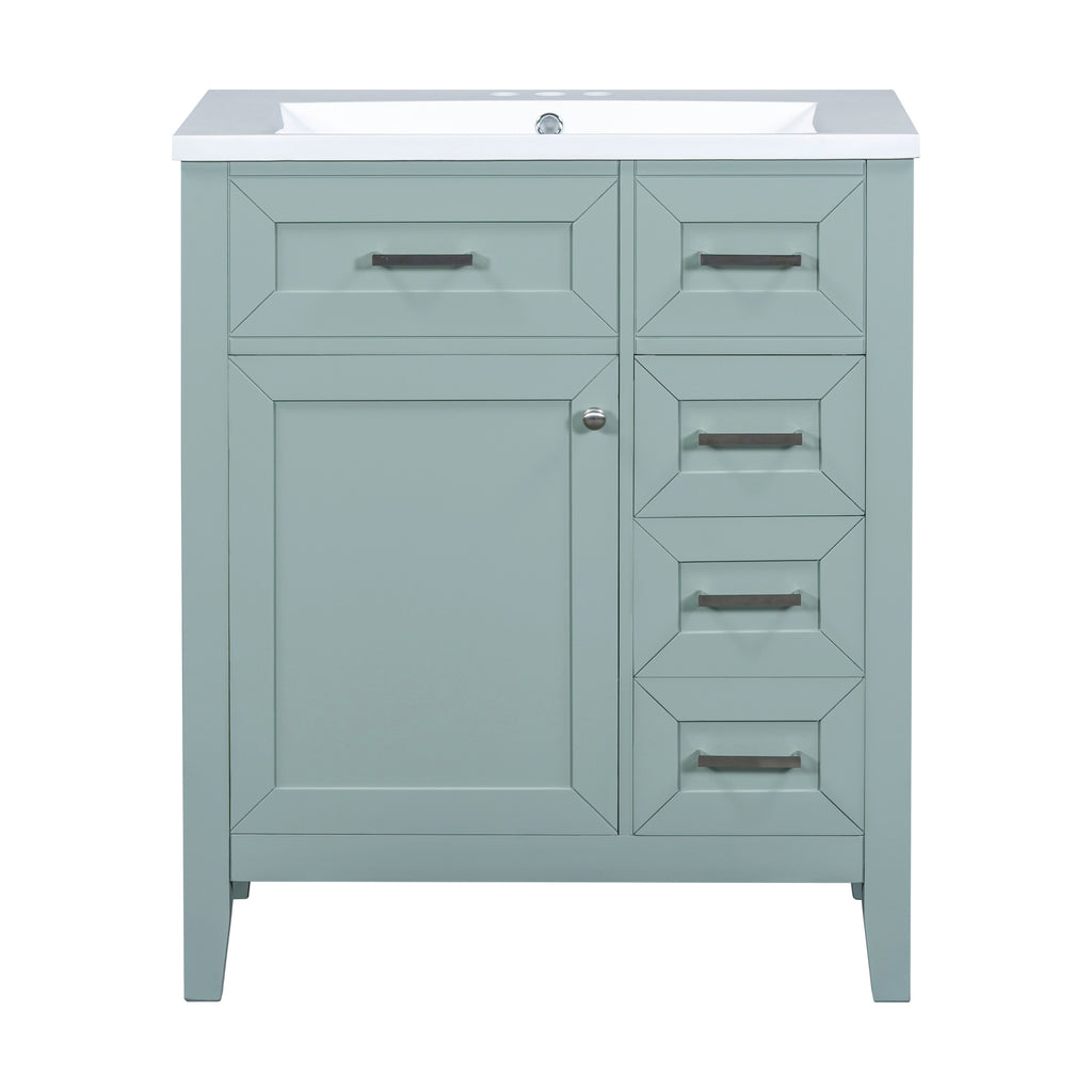 - Stylish 30' Bathroom Vanity: This 30' bathroom vanity is suitable for bathroom in any decoration style. Freestanding green vanity cabinet with silver handles complies with your bathroom facilities. The groove design on the door and drawer increases the artistry and aesthetics of the home environment. If you're looking for a simple but stylish bathroom sink vanity, our product will be a great choice to upgrade your bathroom.