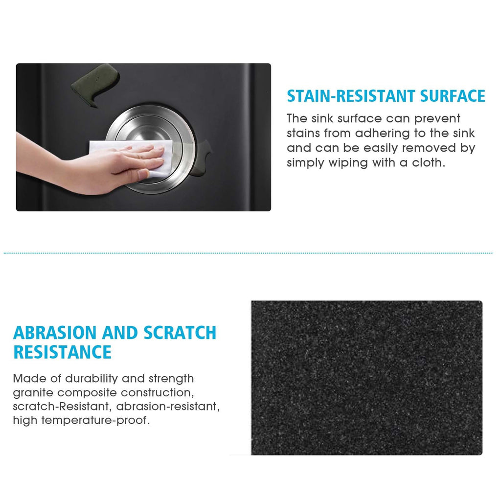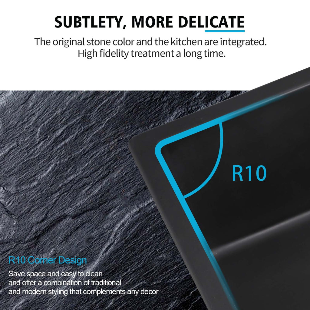We are dedicated to creating elegant, stylish, and high-quality kitchen sinks. This quartz sink is crafted from 80% natural quartz and 20% proprietary resin through high-temperature processing. Advanced proprietary manufacturing techniques ensure uniform material distribution, providing unparalleled resistance to heat impact and damage from dropped items. With no worry about wear and tear, it offers the best experience for your kitchen living.