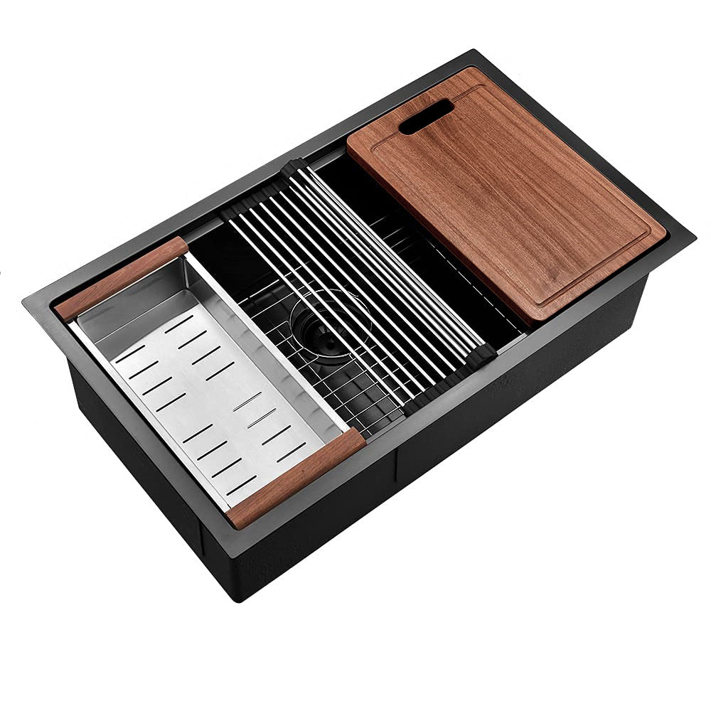 This 32' undermount kitchen sink is made of dent-resistant T304 stainless steel in TRU16 real 18-gauge for superior strength and durability, TRUELY rust and dent resistance. Easy to clean and use long-lasting.This stainless steel kitchen sink with ledges on the front and back provide a track,the track provides us with more space to use.The X groove is designed for easy drainage, the a slight dip at the bottom to prevent water accumulation.Use 3mm sound guard undercoating and thick rubber padding,Ultra quiet designs with thicker & softer Rubber Noise Reduction Pads. Anti-condensation Thickening Noise Reduction Coating, absorb sound from the source, and isolate condensate.