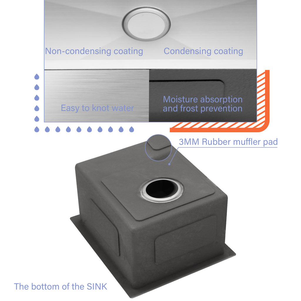 - To create a quieter kitchen environment, soundproofing pads have been added to the bottom of all our stainless steel sink models to reduce the faint sound of running water. As an added protective layer and to prevent moisture accumulation, an anti-condensation spray undercoating is also applied to the exterior of the sink.