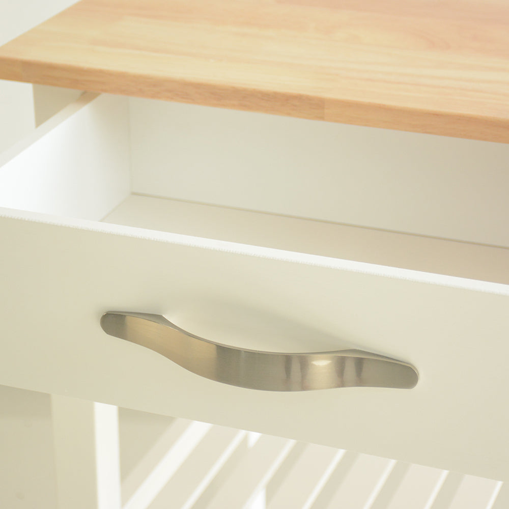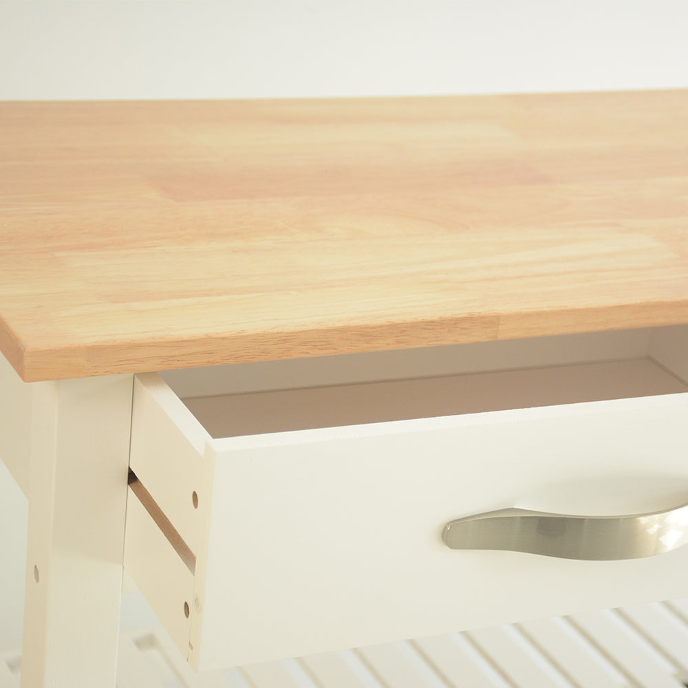 The top plate of the rolling kitchen island cart is made of rubber wood, and the others are made of P2 grade density board. Its material makes it strong and durable. With drawers, open partitions and towel racks, it provides enough space and convenience for storage. Rollable rubber wheels, two can be locked, flexible and stable. Specifications: Color: White-Beech Material:Panel rubber wood, other p2 grade density board Product Dimensions:45 x 17 x 35 inches Package Included: 1 x Kitchen Island Cart