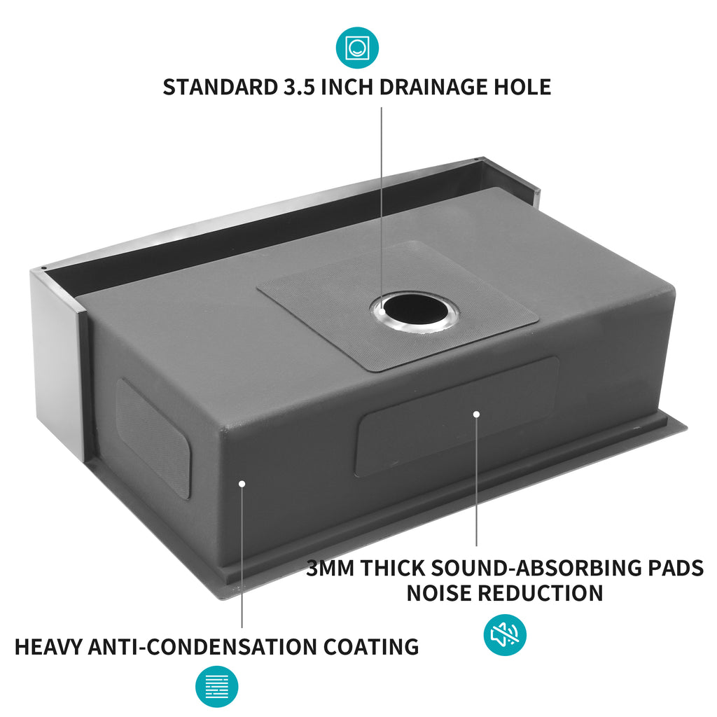 - [Coating and Silencer Pad]There is a thick coating on the outside of the sink to prevent condensation caused by weather changes. In addition, the 3mm thick rubber silencer pad can greatly reduce the noise from the faucet and give you a quieter cooking environment.
