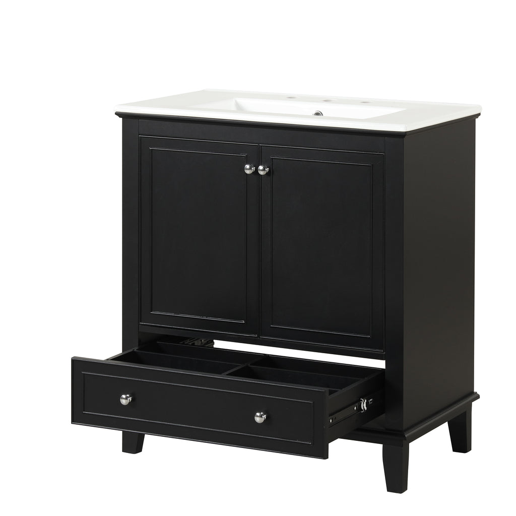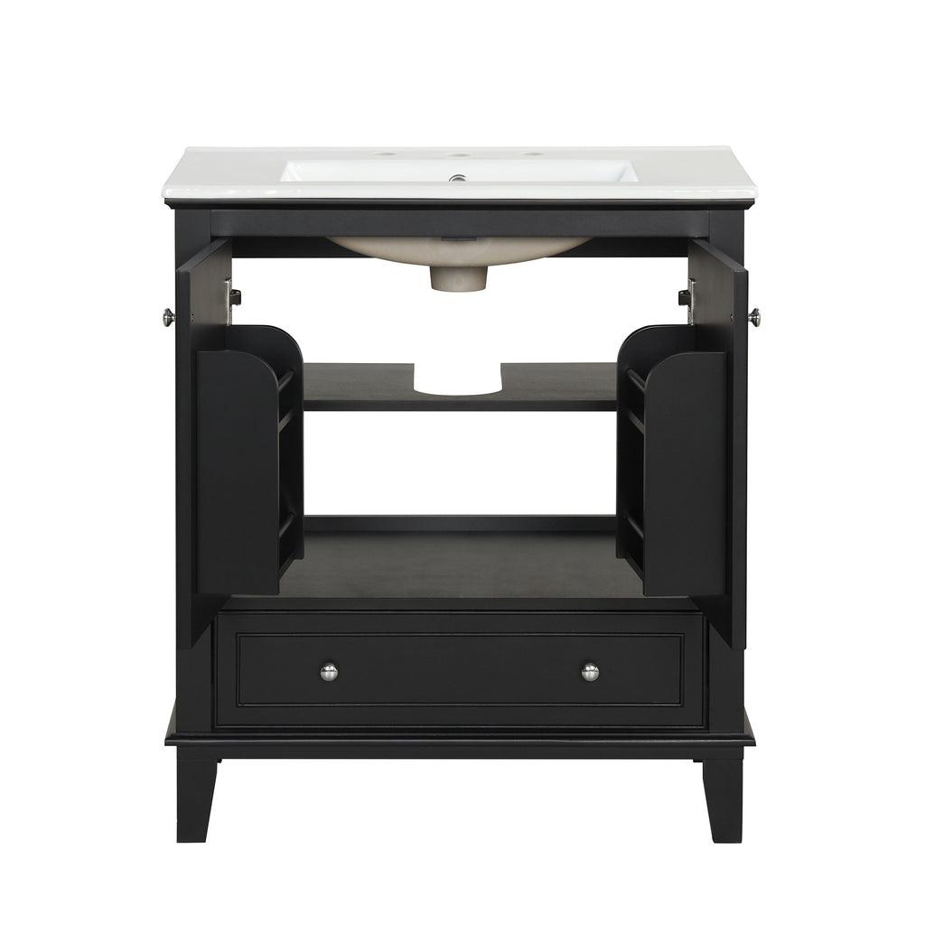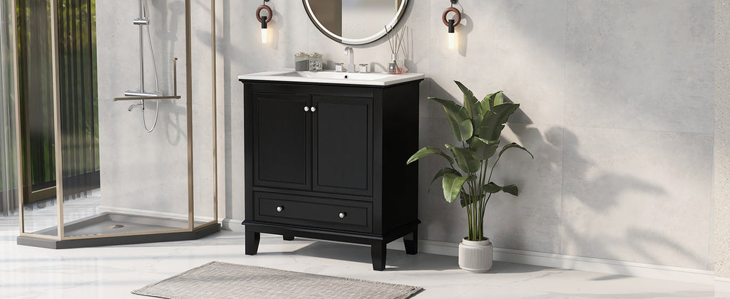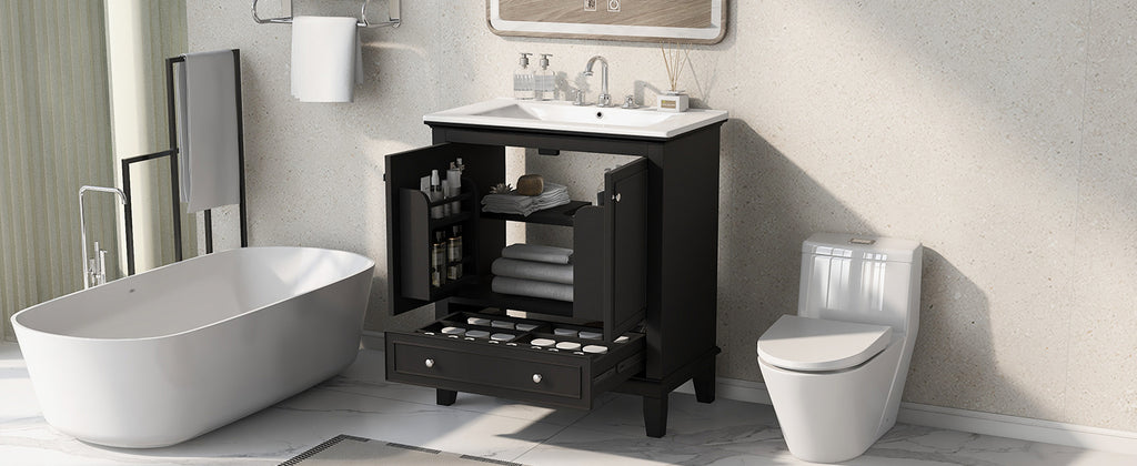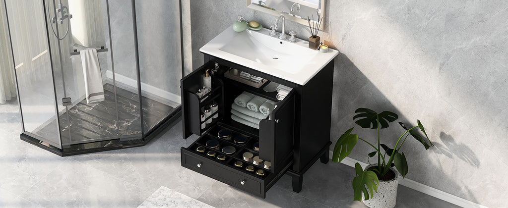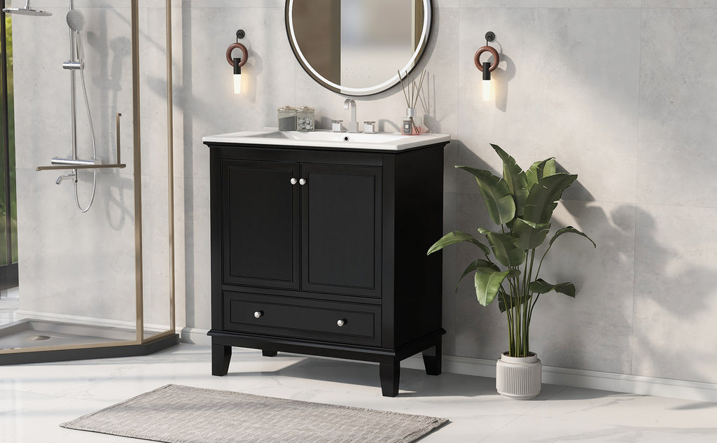 - Assembly Required: This bathroom vanity needs assembly. All the hardware(screws, metal door hinges and handles, drawer slides, anti-toppling device etc.) and instruction manual are provided. You can install it according to the instruction easily.
