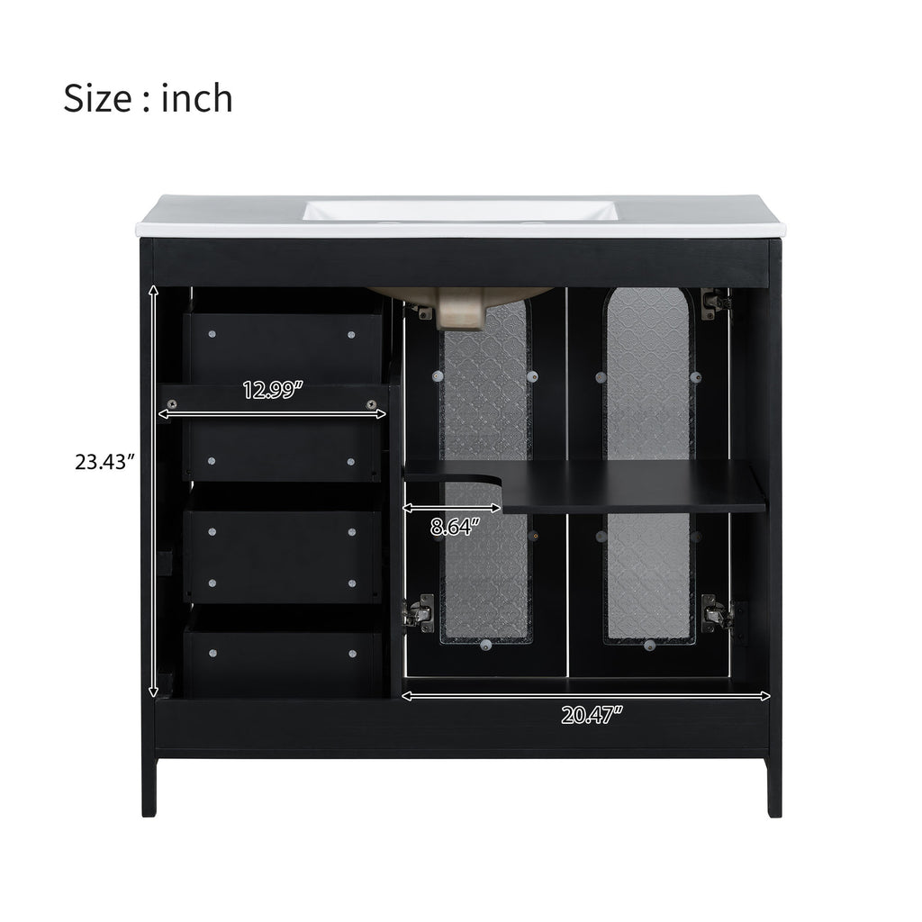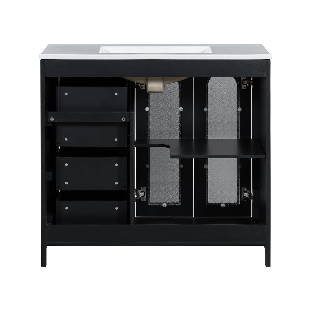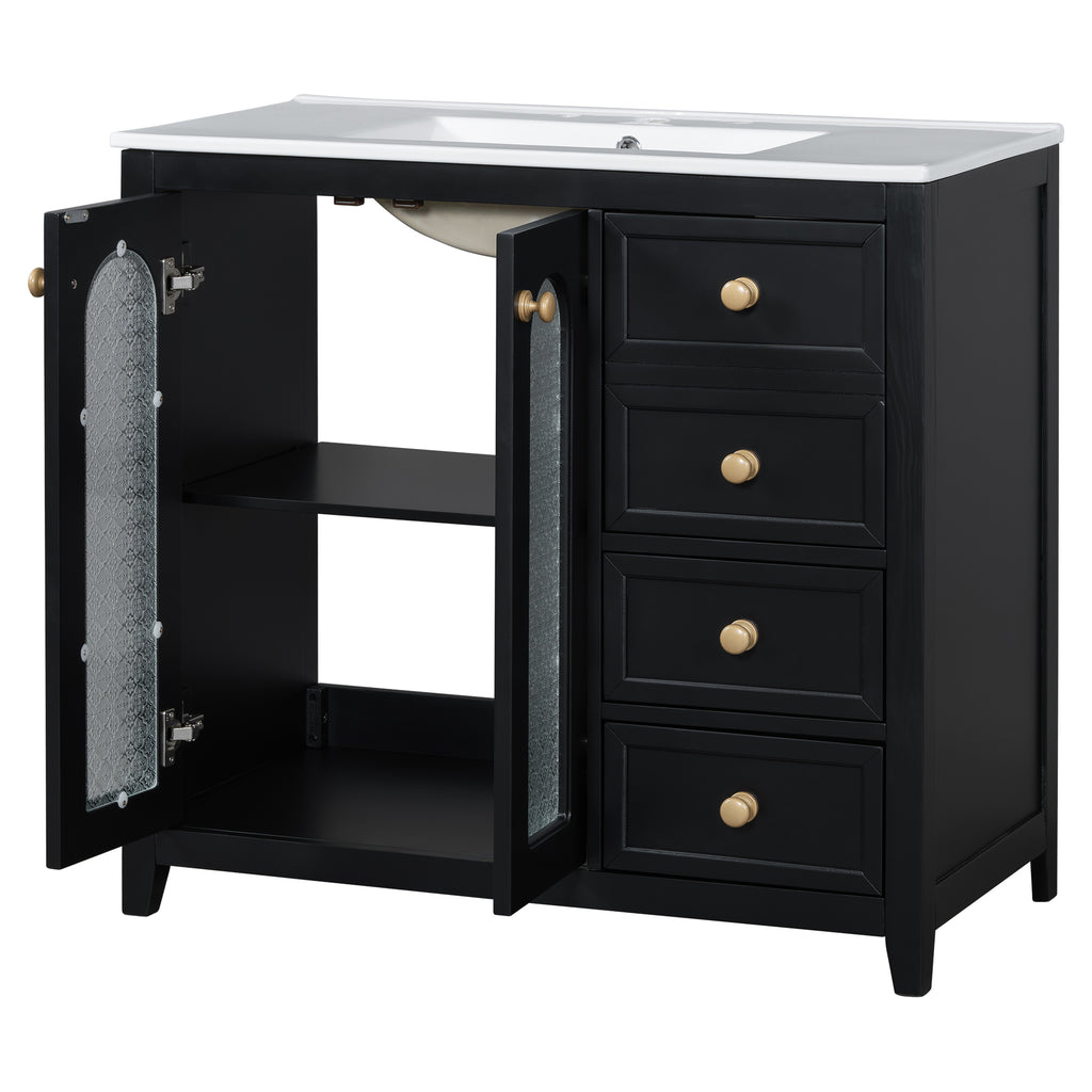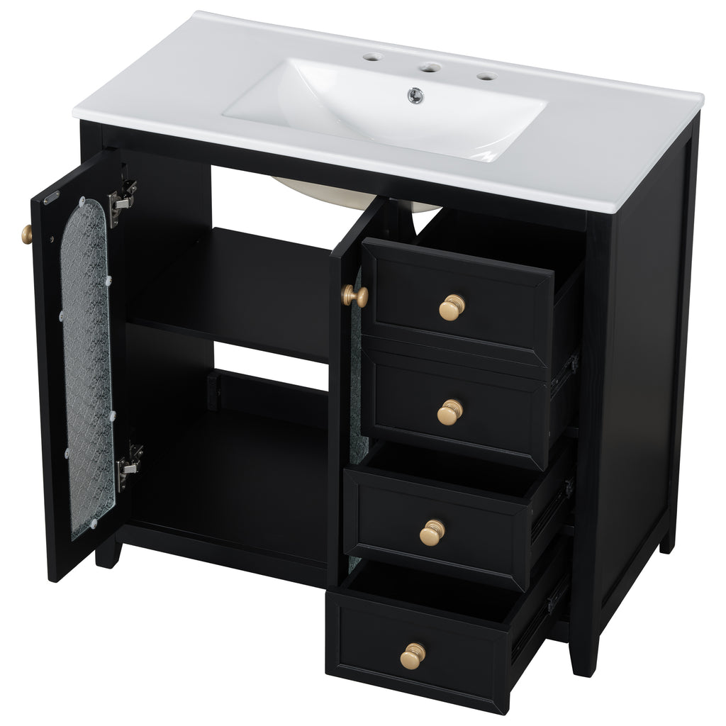 Introducing our 36-inch black vanity with a pristine ceramic basin, adorned with luxurious gold metal round handles. This elegant piece is designed to upgrade any small bathroom, blending style and practicality seamlessly.
