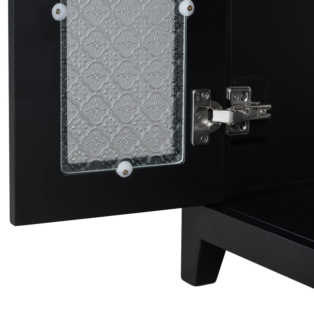 Elevate your bathroom's aesthetics with our vanity's elegant patterned glass doors and opulent gold metal round handles, adding a touch of sophistication to any space.