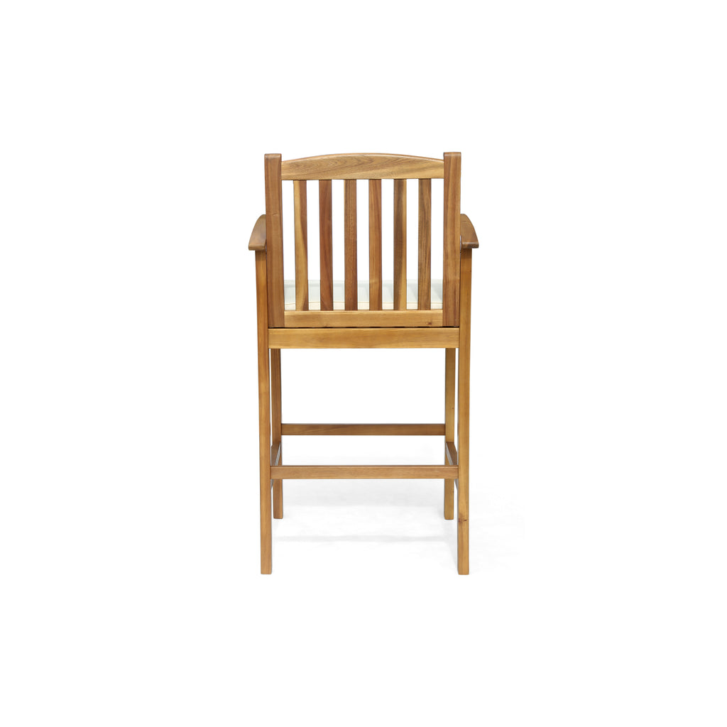 Ever find yourself short on seating during a get-together in your backyard space? A new set of outdoor barstools may be just the ticket. Composed of rich acacia wood and topped with cozy water-resistant cushions, this set of two classy yet modern barstools will not only provide hardy durability but will also complement any outdoor bar or dining set up. These are finished with a beautiful open slat panel design that strikes a perfect balance of rustic charm and stunning sophistication for all to admire. Includes: Two (2) Outdoor Barstools Material: Acacia Wood Cushion Material: Water Resistant Fabric Multiple Color Options Assembly Required Dimensions: 24.00 inches deep x 24.00 inches wide x 45.75 inches high Seat Dimensions: 19.75 inches deep x 20.50 inches wide x 30.00 inches high Arm Height: 38.75 inches Weight Capacity: 400 lbs Country of Origin: Vietnam