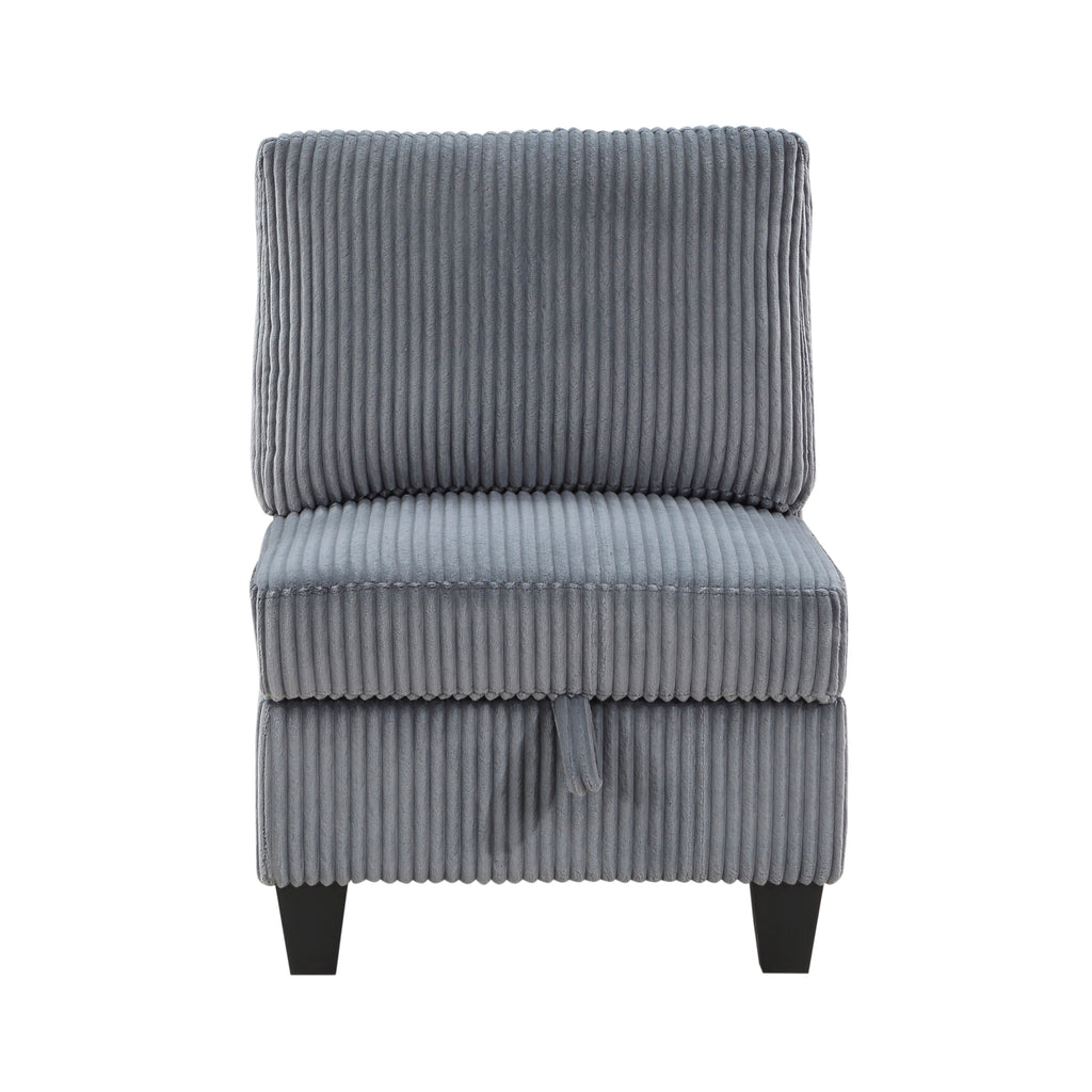 The multifunctional design of the Walterboro Collection creates a seating group that is not only configurable to your available space but serves as a convenient storage spot within your casual living room. Pull-out storage drawers are neatly tucked beneath the armless chair, and end seats of the sectional, each drawer easily accessible with a pull to the front-mounted loop handle. The corner seating unit of the sectional is anchored by one armless chair while the two end seat’s arms provide side support and power charging ports. The collection is covered in dark gray corduroy fabric for a neutral complement to your home’s décor.