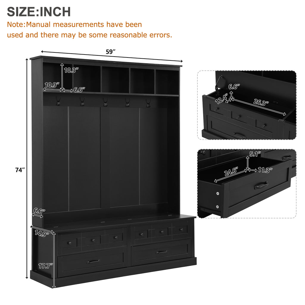 | Detailed Measurement | Overall: 59.0”W x 14.9”D x 74.0”H / Drawer: 24.6”W x 11.3”D x 5.1”H / Top Compartment: 10.9”W x 6.6”D x 10.3”H / Under seat Compartment: 26.3”W x 12.4”D x 6.6”H |