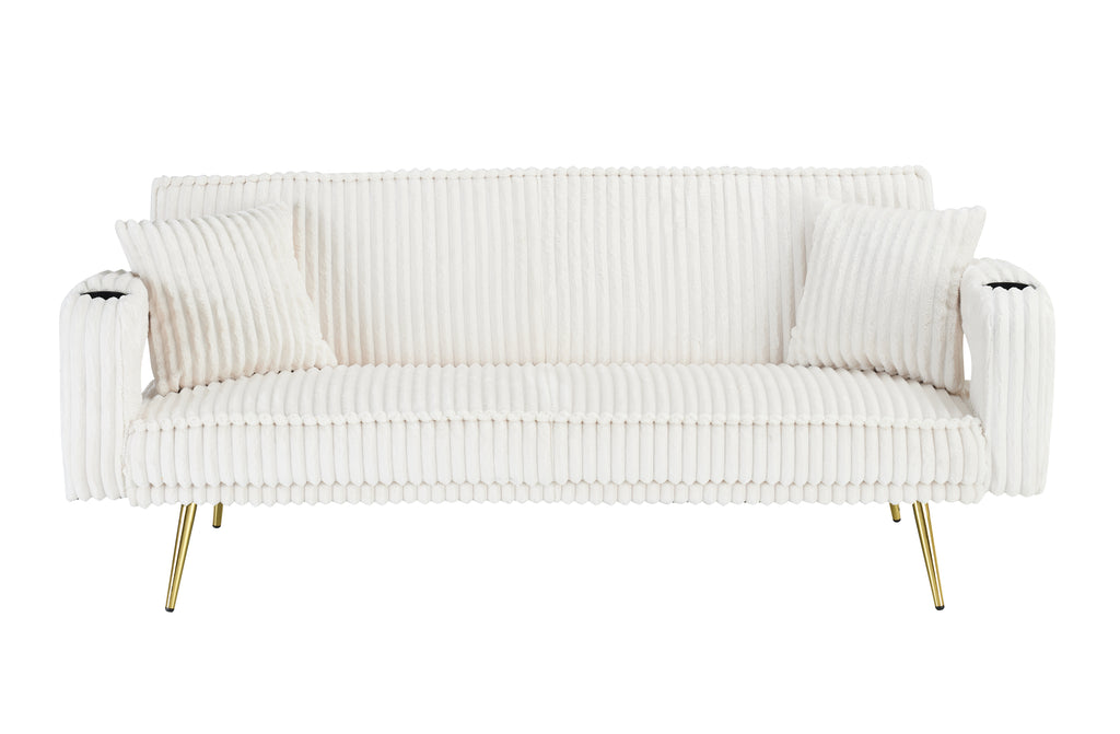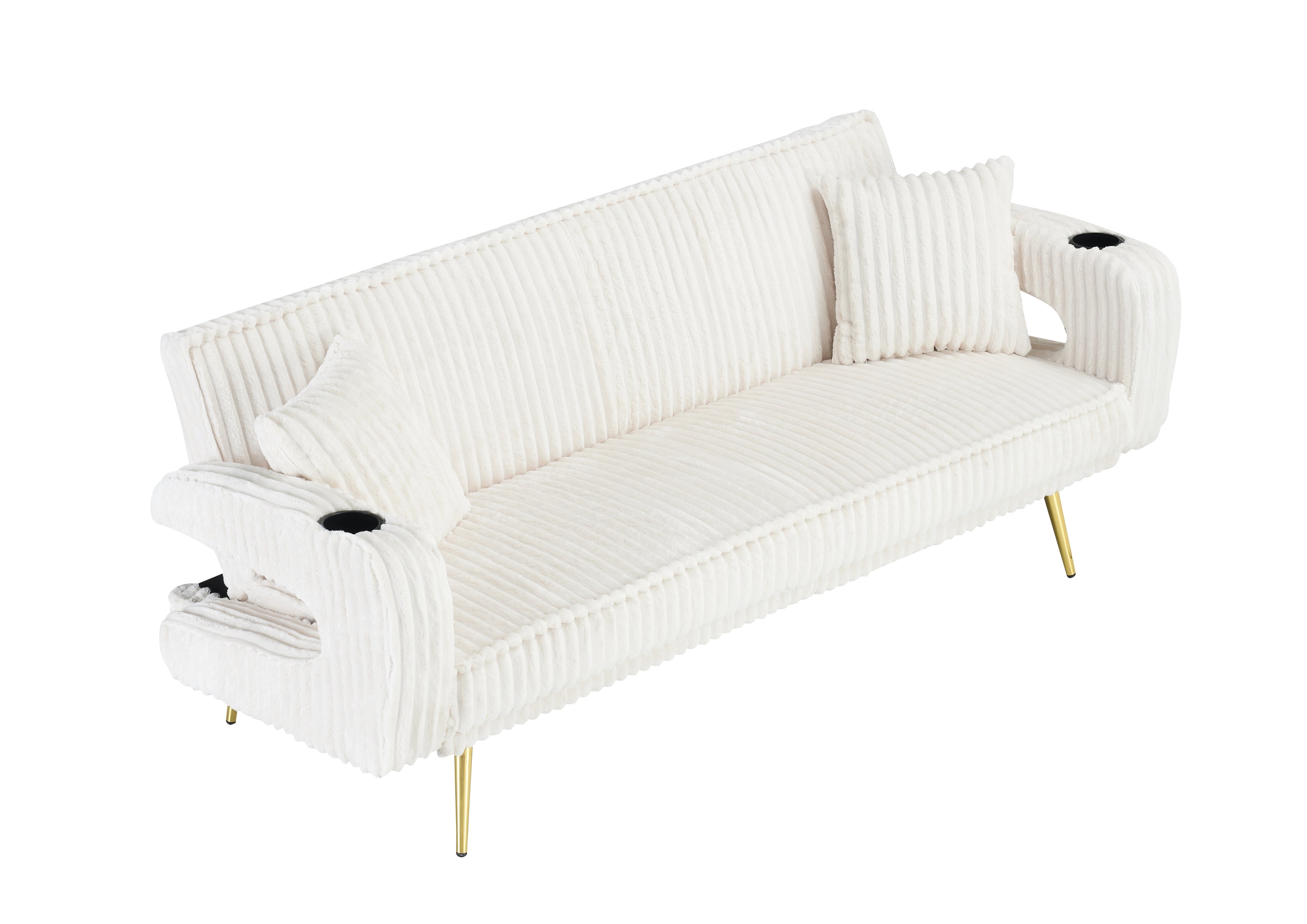 The pure white corduroy fabric has a low-key yet luxurious velvet texture that reflects a soft and elegant luster as the light changes. The sofa has cup holders on both sides of the armrests, so you no longer need to worry about where to place your drinks; just lift your hand and place the cup securely. The backrest has three adjustable positions: the first position allows you to lean back slightly, stretching your spine; the second position increases the angle, allowing you to sink deeper into the sofa, perfect for a lazy afternoon nap; the third position reclines all the way, instantly turning the sofa into a flat, soft bed. When you're tired or sleepy, you can lie down comfortably and stretch out. From daily relaxation to temporary rest, this sofa meets all your needs, supporting every bit of your laziness and relaxation. It's not just a piece of furniture, but a gentle remedy for a tired life.
