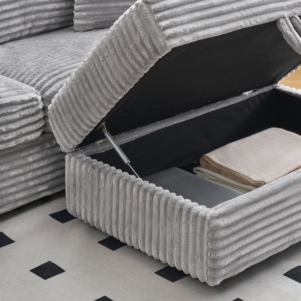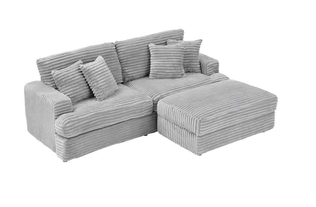 The fabric is made of high-quality grey corduroy, which is delicate, lustrous and full of texture. The exclusive footstool can be moved freely and instantly transforms into an elegant chaise longue, allowing you to lounge around lazily. The footstool shoulders the heavy responsibility of storage, with a large-capacity storage space hidden underneath, which can be regarded as an 'invisible shelter' for household sundries, making the living room cleaner and more spacious. The backrest and pillows are also wrapped in delicate grey corduroy with short and dense fluff, giving a smooth hand feel. The interior is filled with high-quality doll cotton, which is firm and plenty. This grey corduroy fabric sofa combines soft texture, flexible design, powerful storage and considerate companionship. It is not just a sofa, but also a warm support in a tiring life and a capable assistant in daily trivialities.