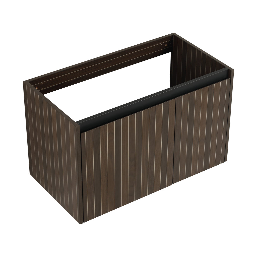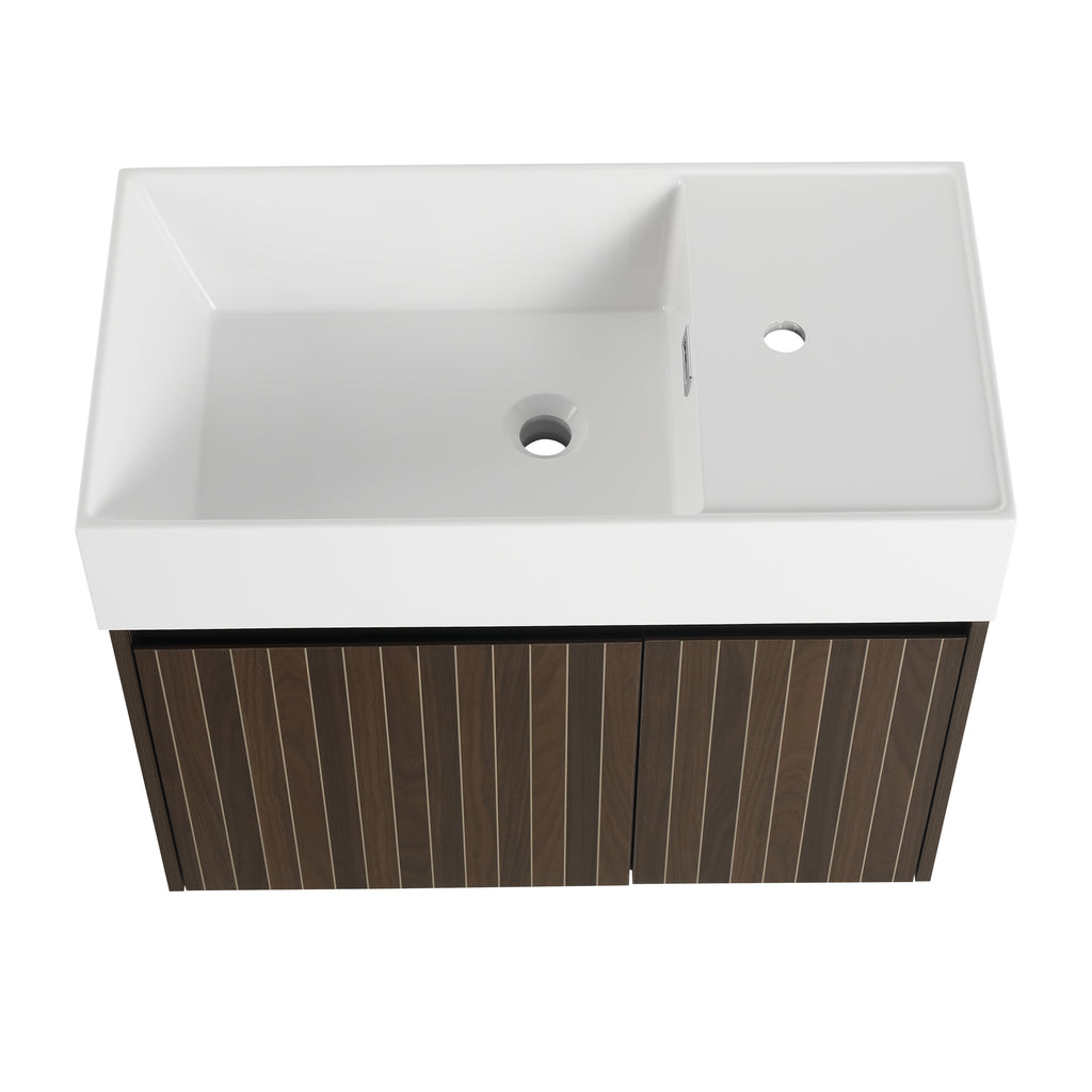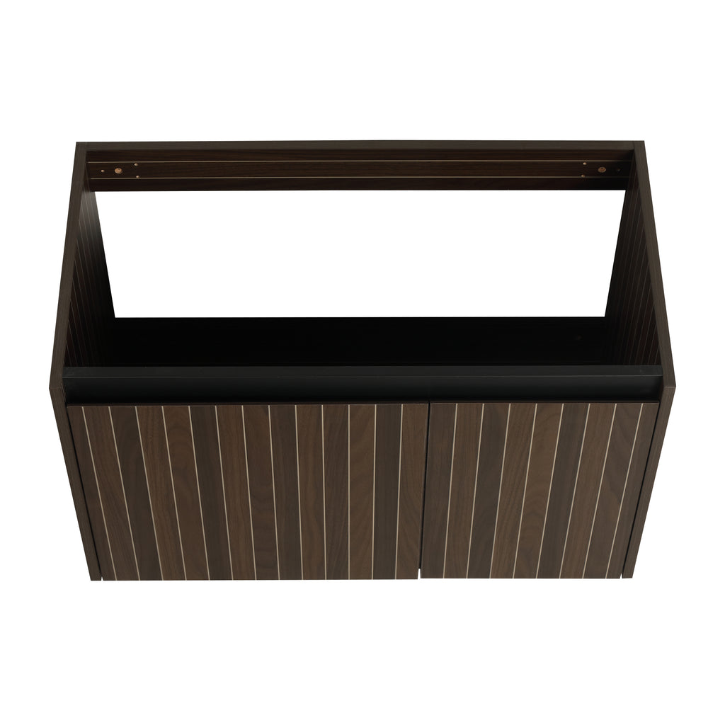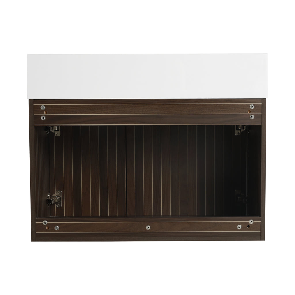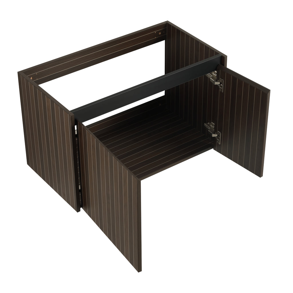 This wall-mounted bathroom vanity stands out with its unique Silver-Brown Stripe design, where the dark wooden texture beautifully contrasts against the white background, creating a stylish yet cozy ambiance in your bathroom. The double-door design is not only visually appealing but also significantly enhances storage capacity, allowing you to effortlessly organize all your bathroom essentials and maintain a tidy and organized space. Thoughtfully designed interiors offer ample storage room to cater to your diverse storage needs.