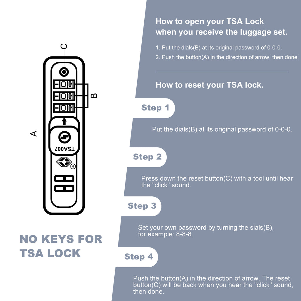 - TSA lock allows only customs agents to inspect your luggage without damaging the lock when traveling and protects your stuffs in luggage and privacy more better. Simply set the combination. No keys are required.