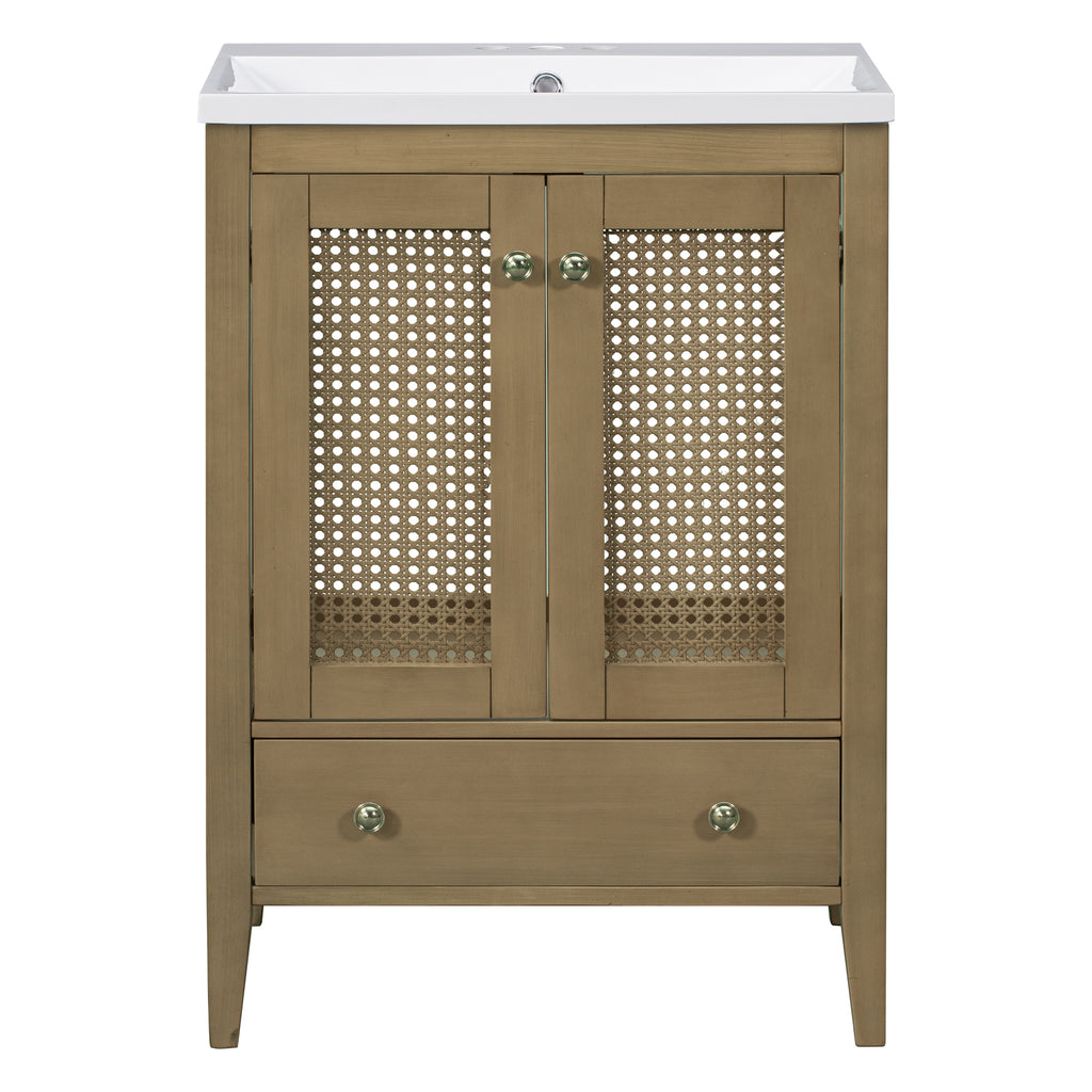 This bathroom vanity adopts nature style, highlighting fresh and graceful, comfortable style, the main body uses elegant natural wood color, simple lines, practicality and aesthetics are high. The woven hollow design of the two doors of the main cabinet is beautiful and creates a perspective space effect, which is also convenient for daily use to take items. Ample storage spaces can accommodate all kinds of daily items in bathroom. Tapered legs with a certain height are designed to facilitate bathroom floor cleaning. Hardware hings and handles are benefit for long-term usage. And the anti-toppling fitting can prevent users from accidental injury. The ceramic basin has smooth surface and waterproof, and it is easy to clean. This natural bathroom vanity is suitable for many home styles, elegant and practical.