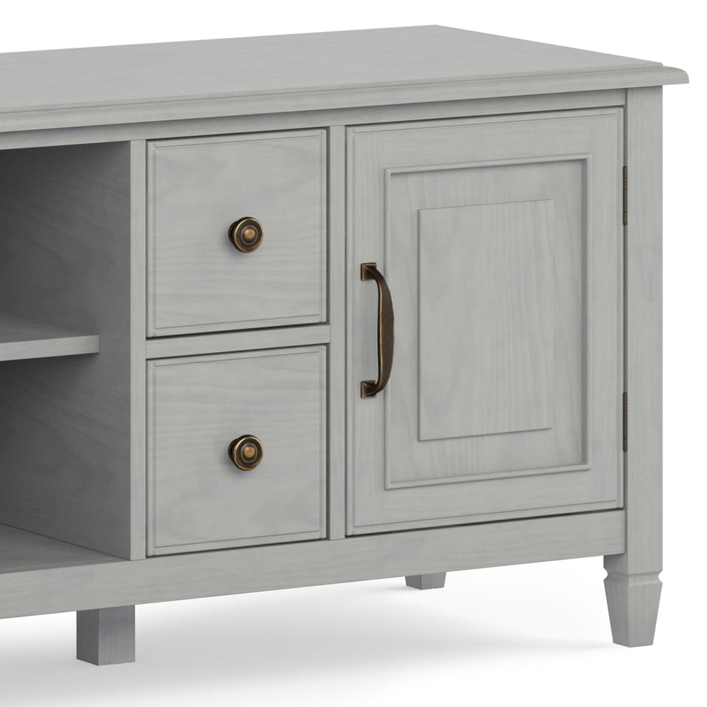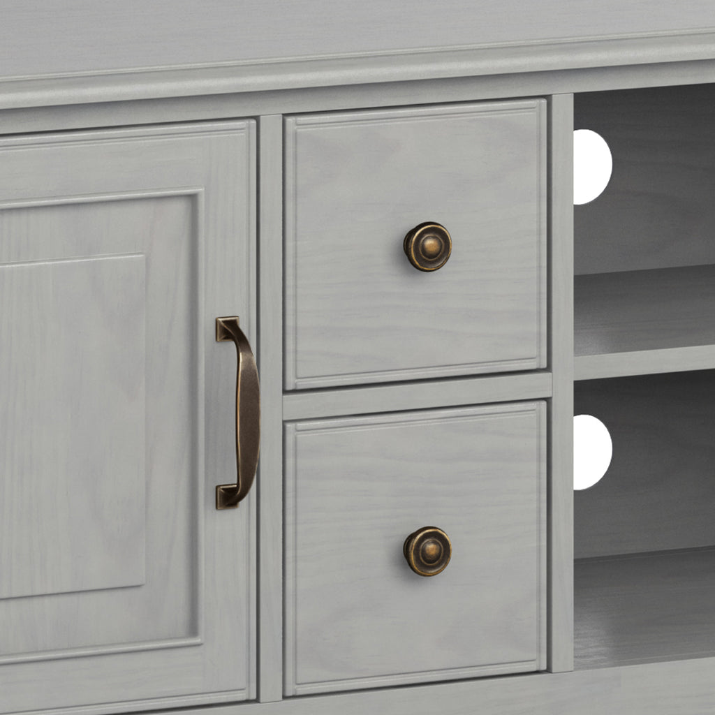 - Traditional style Includes vintage raised panel doors and drawers, notched legs, Bronze decorative hardware and metal drawer glides