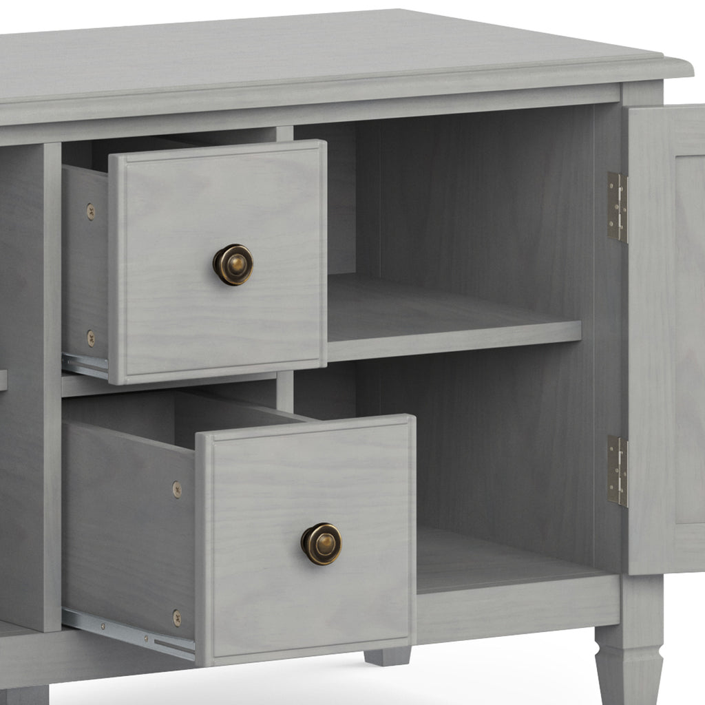 - Features a large centrally located open area with four (4) side drawers as well as two open spaces; the two (2) large side storage cabinets open to one (1) adjustable shelf each