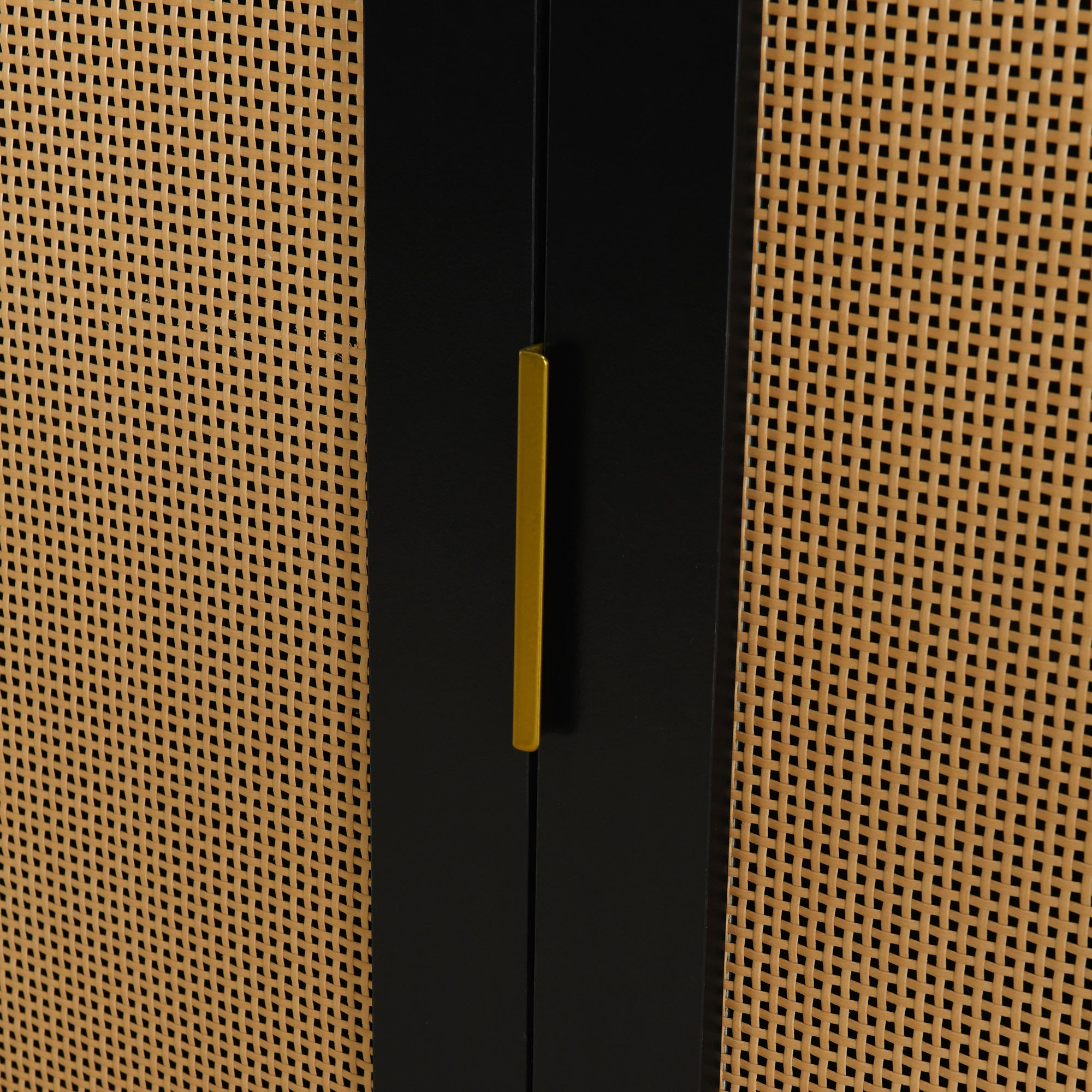 Crafted from premium particleboard, It ensures sturdiness. The two doors feature finely crafted rattan, guaranteeing long-lasting use. The gold handles, legs, and side supports are all power coating, resulting in a smooth surface that not only adds a touch of luxury but also enhances durability and stability. The gold vertical bars that support the shelves add a touch of sophistication and reinforce the luxurious feel.