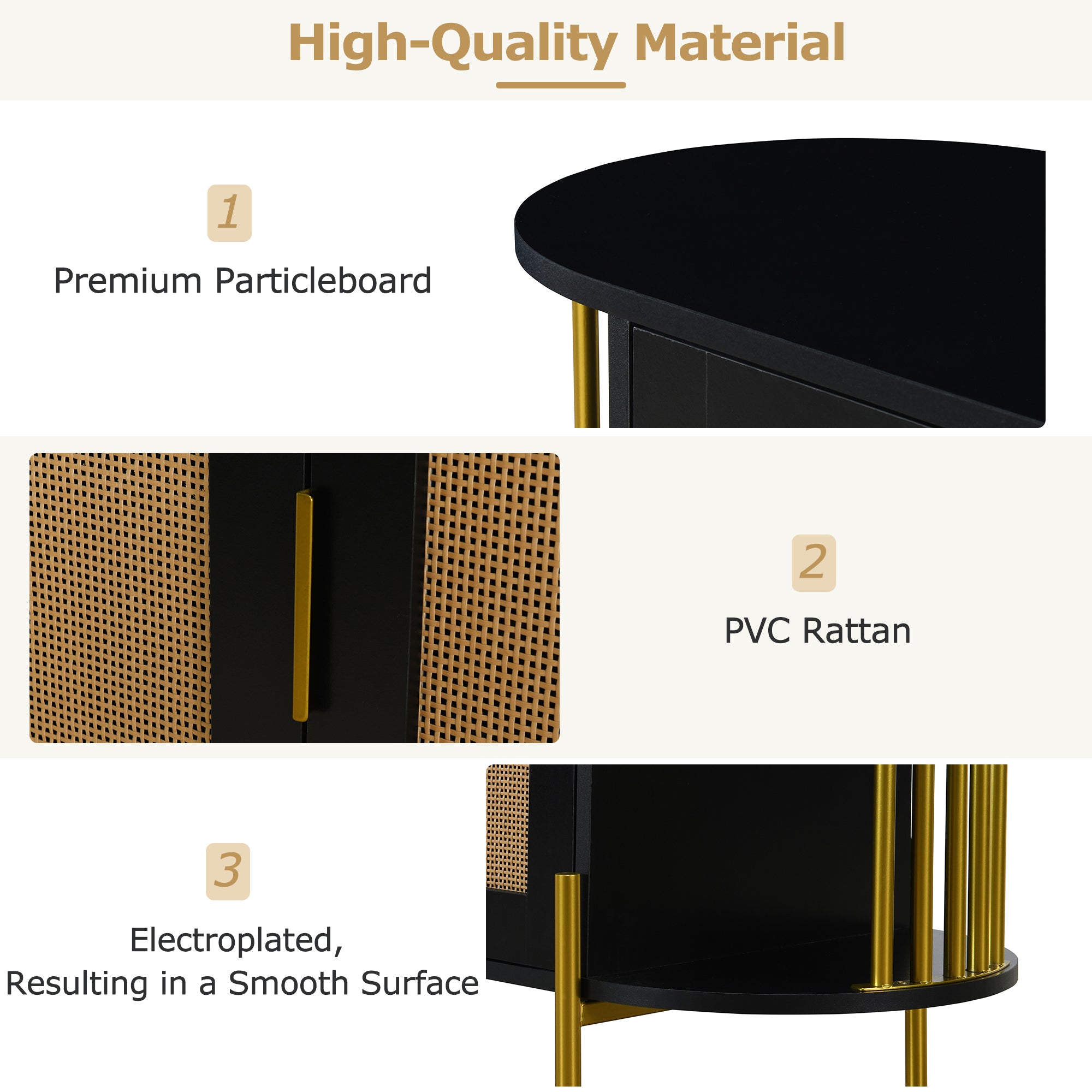- High-Quality Material: Crafted from premium particleboard, It ensures sturdiness. The two doors feature finely crafted rattan, guaranteeing long-lasting use. The gold handles, legs, and side supports are all power coating, resulting in a smooth surface that not only adds a touch of luxury but also enhances durability and stability. The interior includes an adjustable shelf to meet storage need. Tabletop weight capacity: 331 lbs; Shelves weight capacity: 110 lbs.
