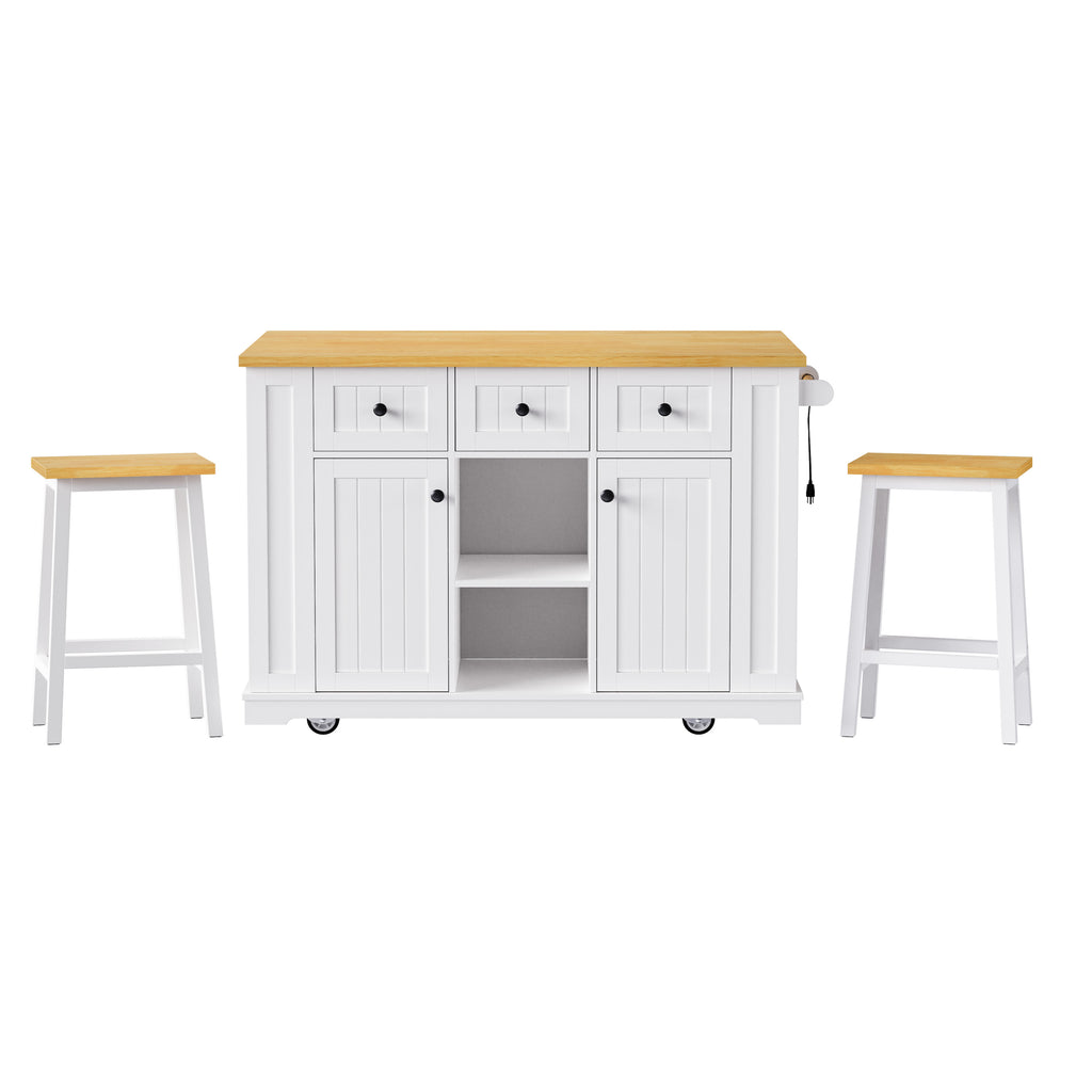 | Summary | The 3-piece kitchen island set fuses classic style, high-end details, and versatile storage. Crafted from CARB Phase II certified MDF boards, its 50''-wide countertop features a smooth, scratch-proof laminate finish table that's great for food prep. The island includes an abundance of storage options: Two cabinets contain 2-tier door interior storage rack for spice and jars, while 2 side open shelves with bamboo sticks specifically designed for organizing spices,bottles and wine. Power outlet and towel racks on same side add another level of functionality. Plus, it comes with two included chair stools that let you settle in for daily breakfast or weekend brunch. |