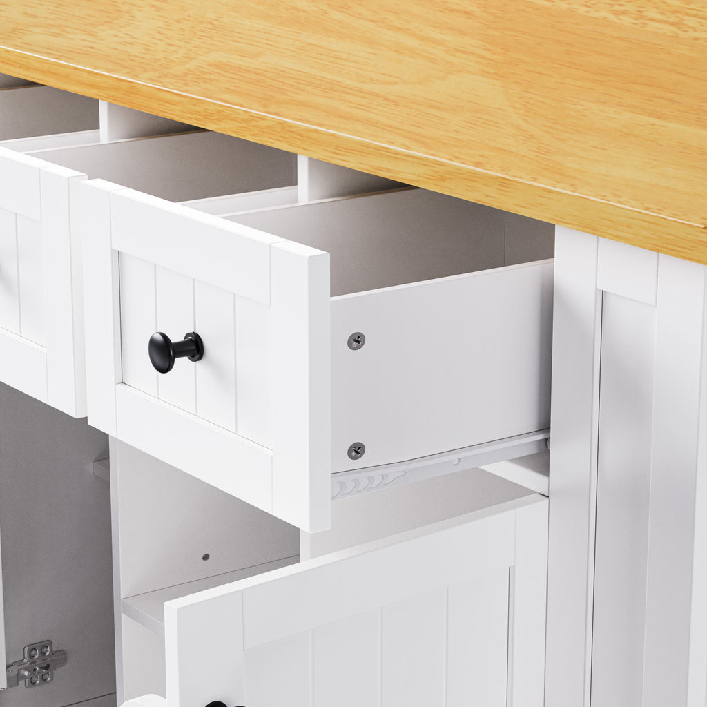 | Highlights | [Internal Storage Rack][Large Kitchen island with 50” W Table] [Drop Leaf][2 Doors + 3 Deep Drawers] [Ample Storage Space][Power Outlet 3AC 2USB] [5 * 360°Hidden Smooth Rotation Wheels with 2 Lockable] [Slow-close Hinges][Spice Rack &Towel Rack][Adjustable Shelves] [Eco-friendly manufactured P2 MDF Board][Bamboo Sticks] |