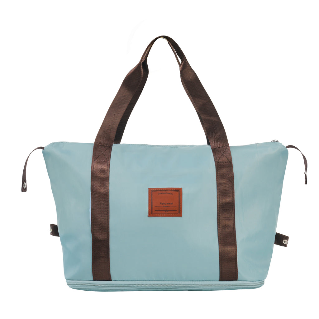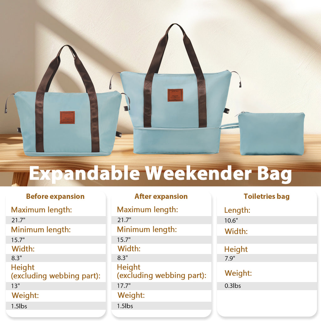 - Expandable duffel bag dimensions (front shape is trapezoidal): longest length: 21.7', shortest length: 15.7', width: 8.3', height: 13', expanded height: 17.7'. The duffel bag comes with a trolley sleeve with zippered pocket, and you can conveniently attach it to the adjustable handle.