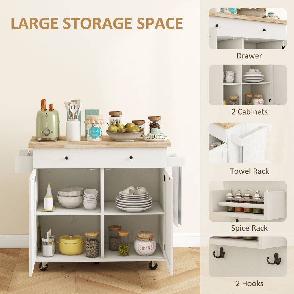 - Added Convenience: Complete with a spice rack, towel rack, and two hooks, this small kitchen island ensures your cooking essentials are within reach, enhancing your kitchen's functionality.