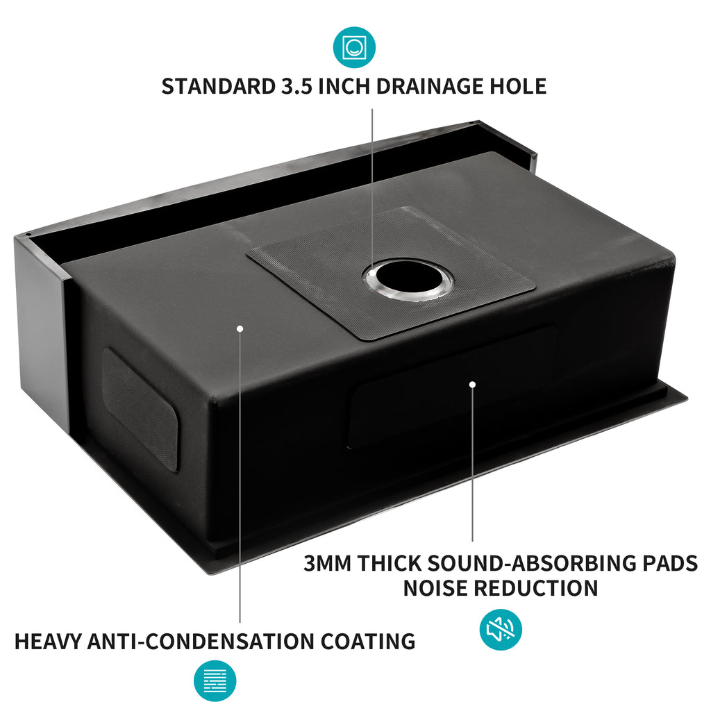 - [T304 Stainless Steel 16G Construction] This 36' farmhouse sink is constructed with heavy-duty 16-gauge T304 stainless steel. The gunmetal black finish is applied as an outer layer using an innovative Nano-PVD technique, offering anti-physical scratching, anti-pot bowl bump, no water trace left, anti-freezing heat, non-seepage water, long-lasting durability.