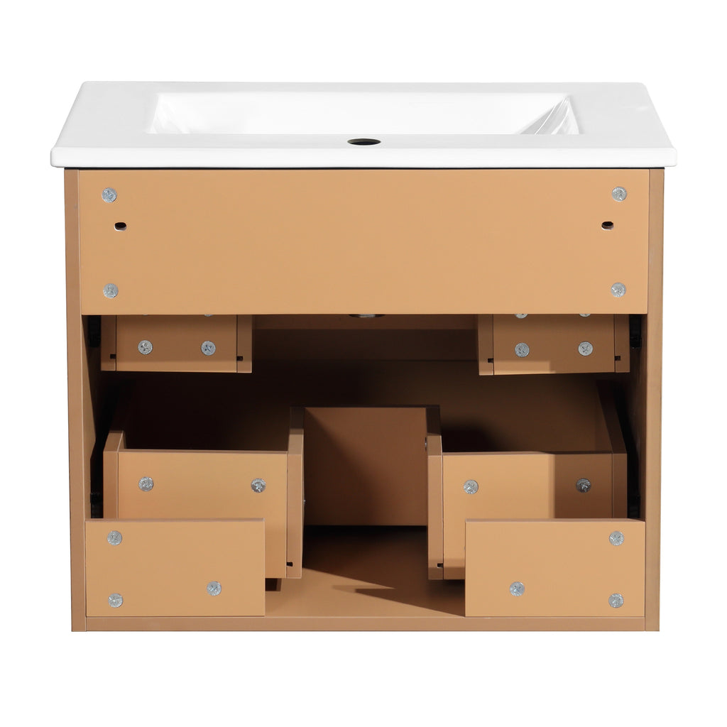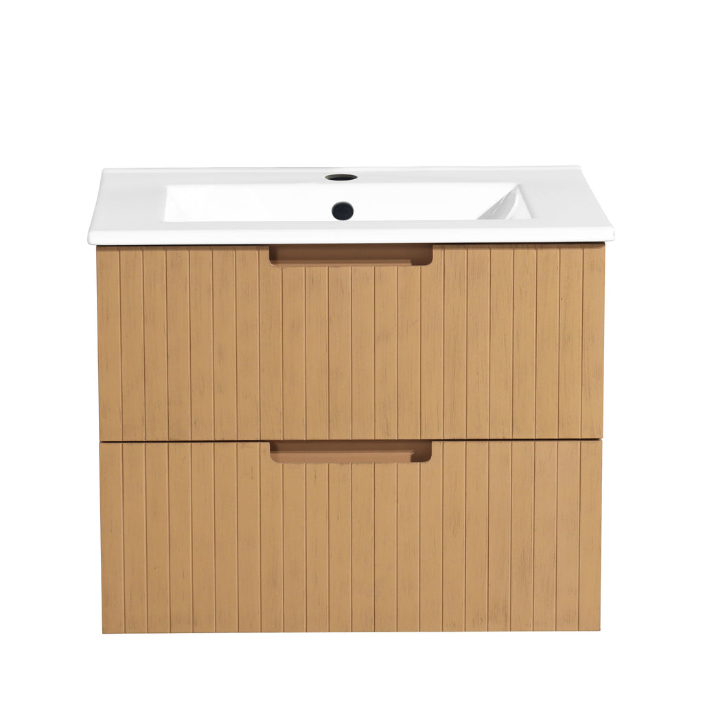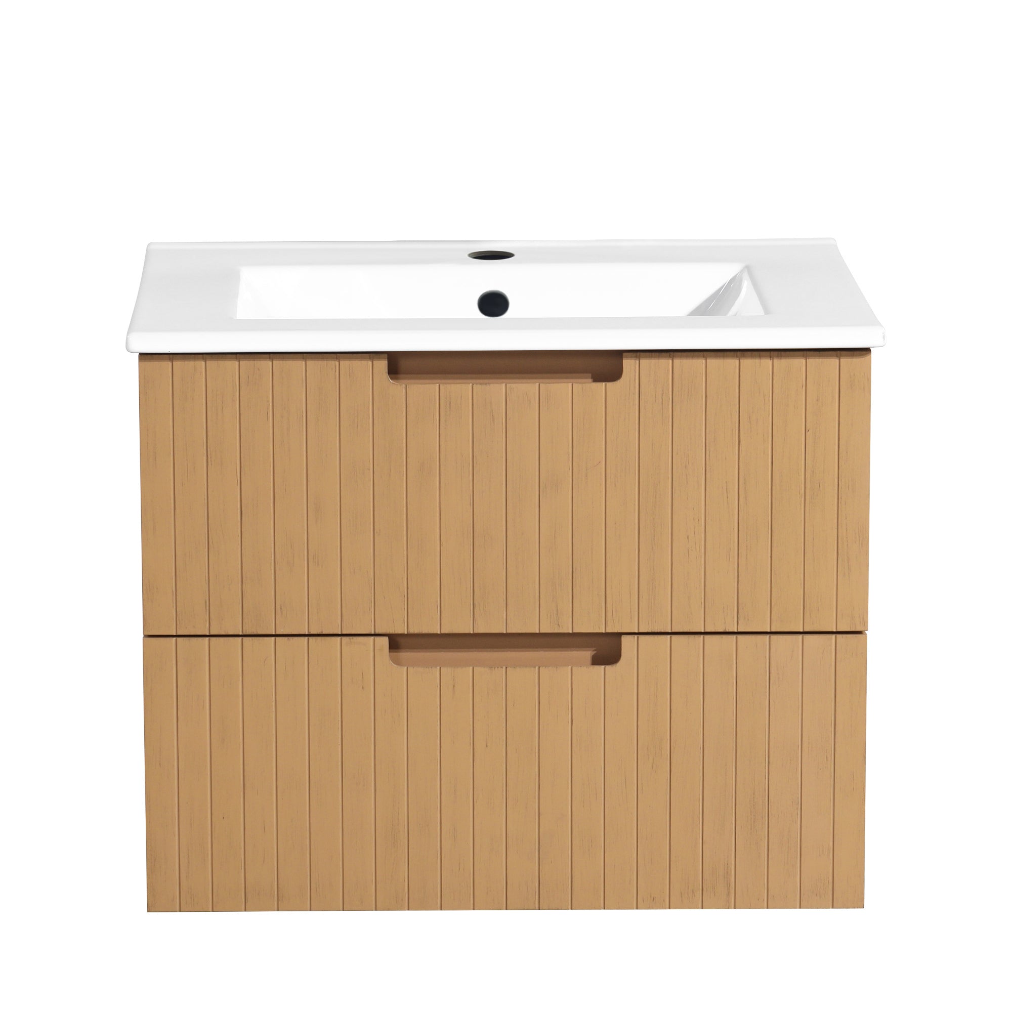 It features a high-quality ceramic sink and spacious storage drawers, providing ample space to keep your bathroom tidy and organized. The wall-mounted design not only saves floor space but also makes cleaning easy.
