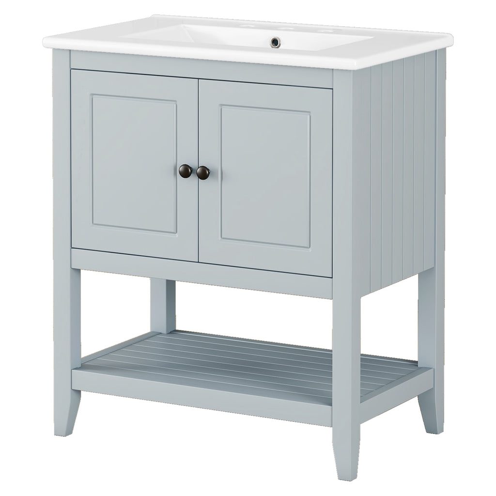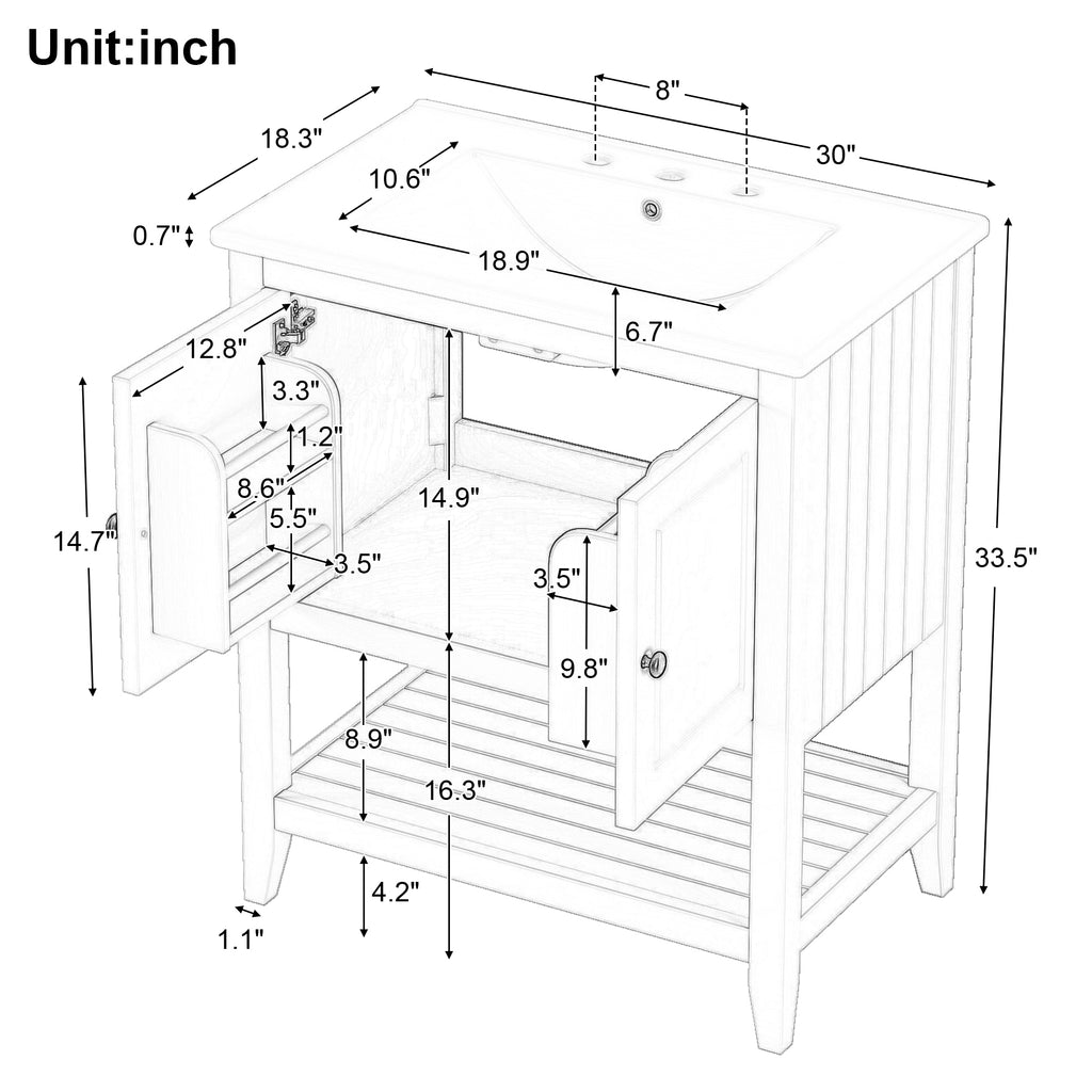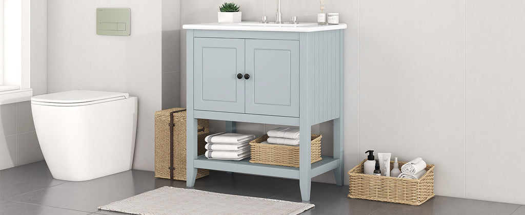 - Ample Storage Space: This simple and practical design freestanding bathroom vanity features a cabinet and an open style shelf for storing bathroom essentials. Both the cabinet and the open bottom shelf are spacious, and both offer enough space to most necessities used in bathroom. With a hollow-out design MDF board, the open bottom shelf is a perfect place to accommodate bath stuff such as shampoos or towels.