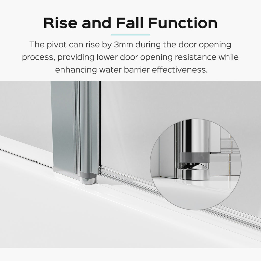 - FRAMELESS PIVOTING SYSTEM: This shower tub door is installed to the wall,it has a fixed glass and a movable glass, the movable glass panel itself can be rotated 90 degrees inside and out and allows a wide range of access without taking up too much space. As well as, this bathtub door can be installed with left side opening or right side opening based on customer's preferenceflexible and comfortable.