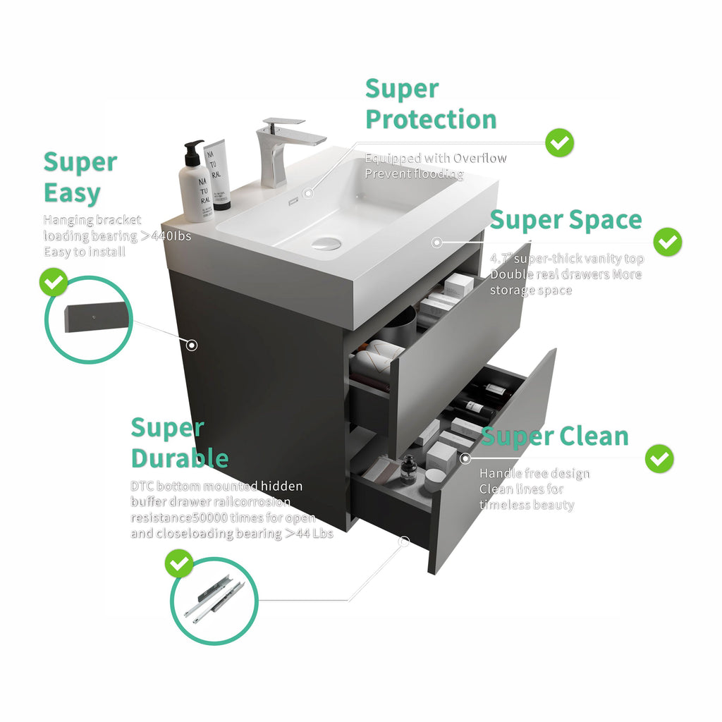 Alice's integrated 45° sloping handle-free design adds a touch of sophistication while maintaining a clean and minimalist look. Crafted from E1 grade environmentally friendly boards, this vanity is not only aesthetically pleasing but also eco-conscious.
