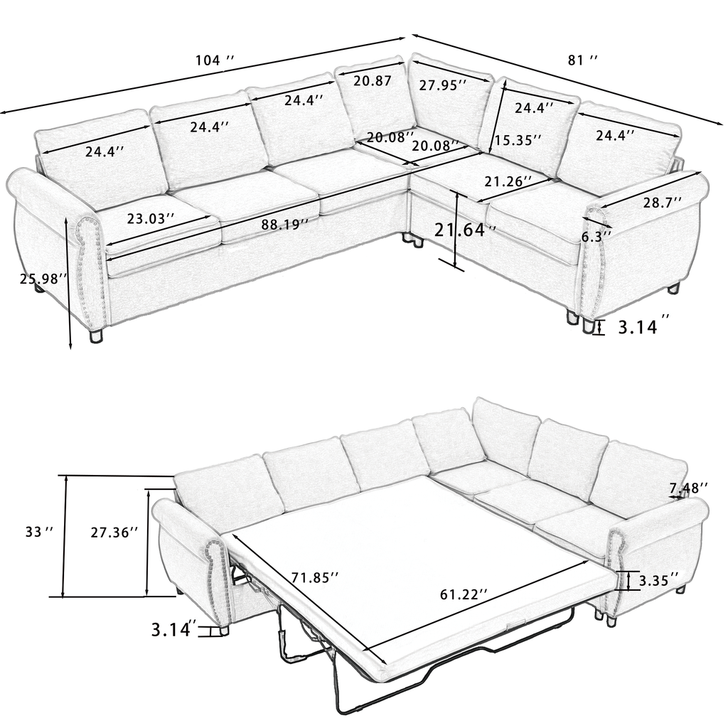 This spacious sectional sofa is perfect for entertaining and relaxing This sectional sofa is the perfect blend of size, style, and comfort. Measuring 104'D x 81'W x33'H, it's spacious enough to fit your entire family and provide ample seating for all your guests. The L-shaped design allows you to pull out the loveseats part in the middle to form a bed, increasing the space utilization of your living room. The sofa is made of high-quality materials including a sturdy wooden frame, metal legs, and soft polyester upholstery fabric. The seating experience is enhanced with spring packs, high-density sponge, and removable backrest cushions.