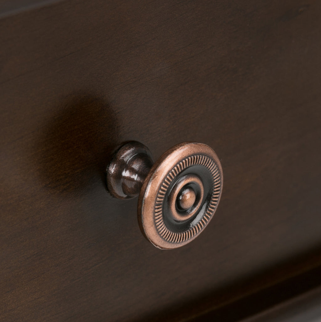 - Features flip down drawer front reveals an internal keyboard tray and bronze rounded knobs