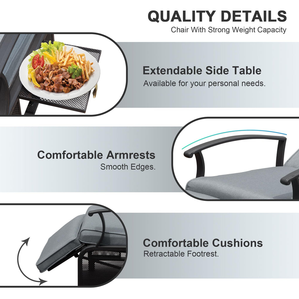 - Optimal Comfort: Embrace ergonomic perfection with the reclining patio chairs' gracefully curved armrests, ensuring blissful arm support. Luxuriously sectioned cushions cradle your back and neck, while the effortlessly accessible recliner handle exudes sophistication and ease.