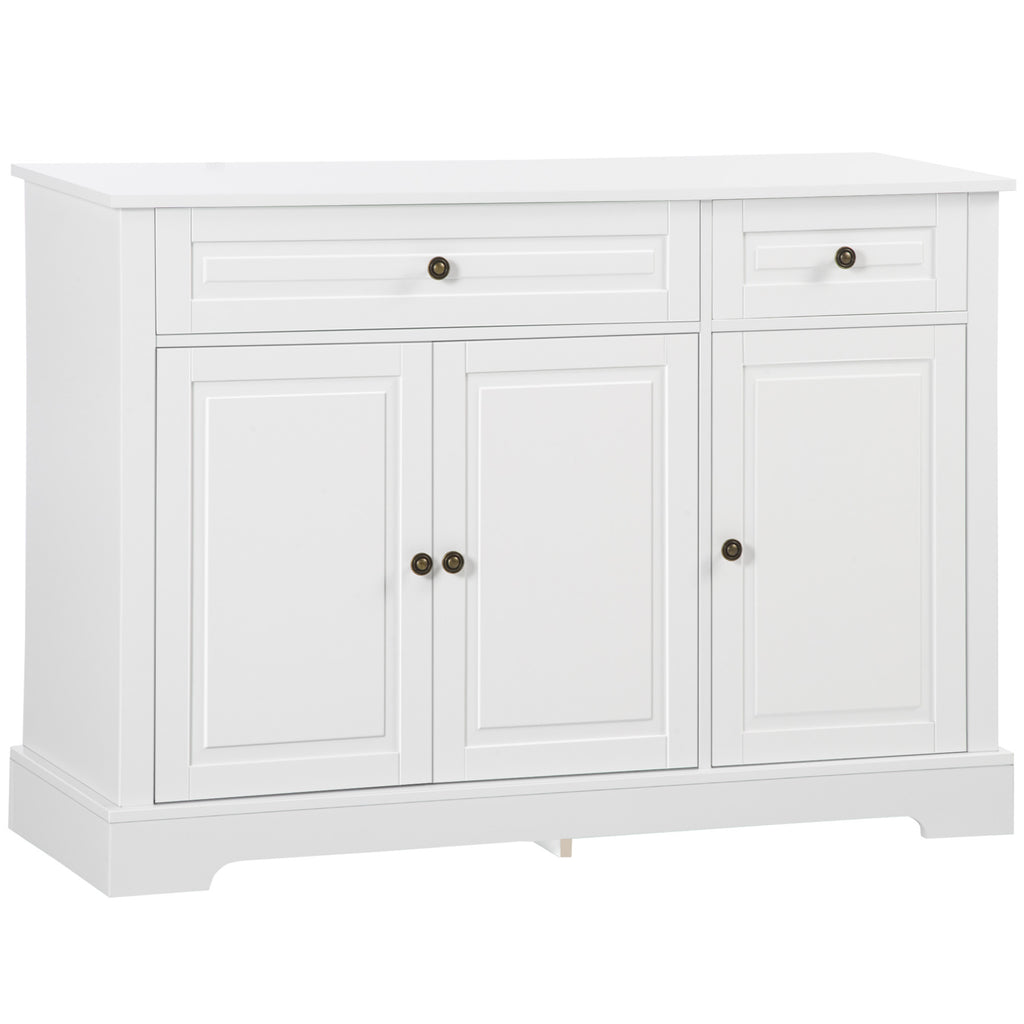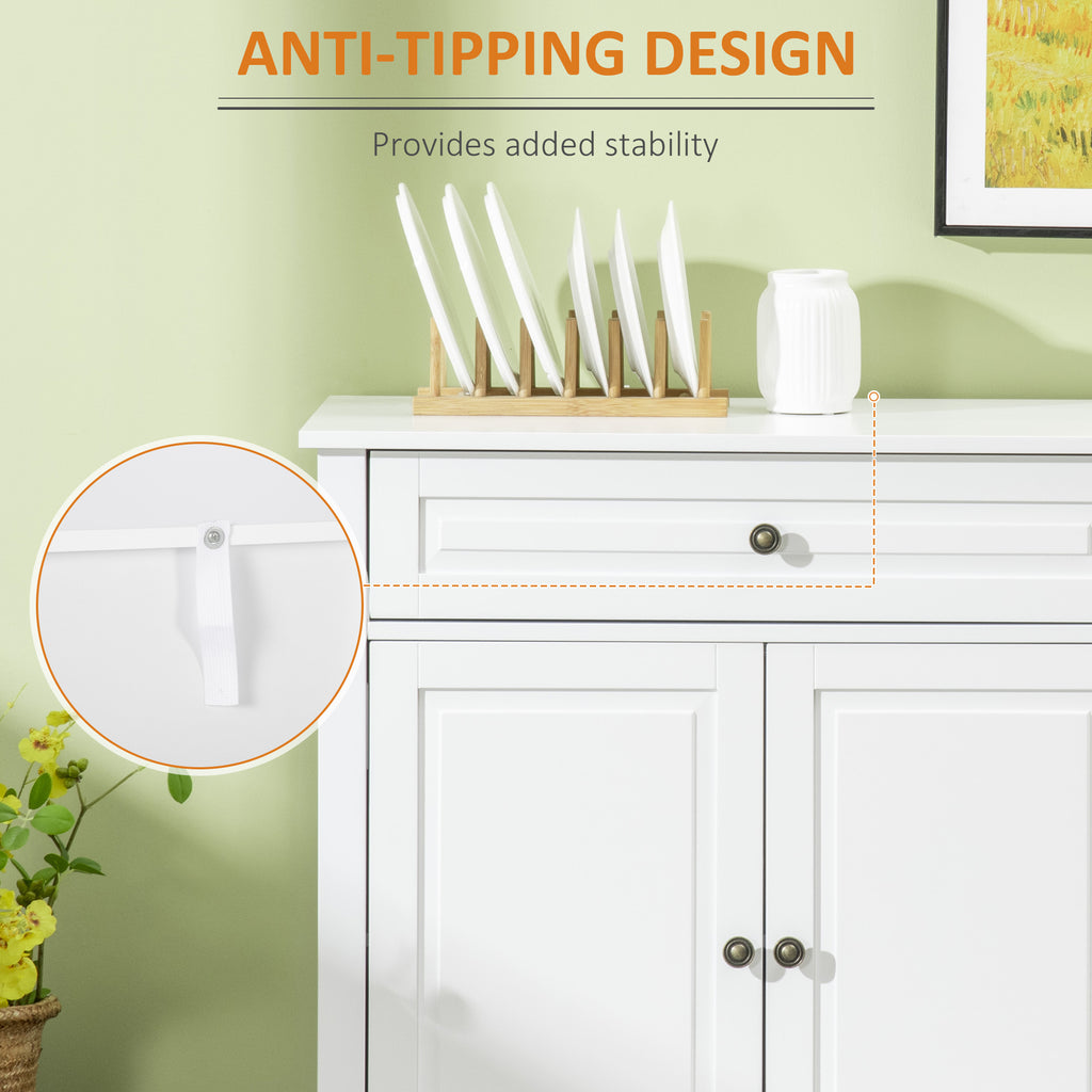 - Multifunctional Storage: Set the serving dishes on the top, place the spoons and folks in the drawers, and tuck the cooking utensils inside the sideboard cabinet to keep your items hidden and free from dust. The recessed door panels and antique metal knobs make this kitchen storage cabinet a low-key statement to your house.