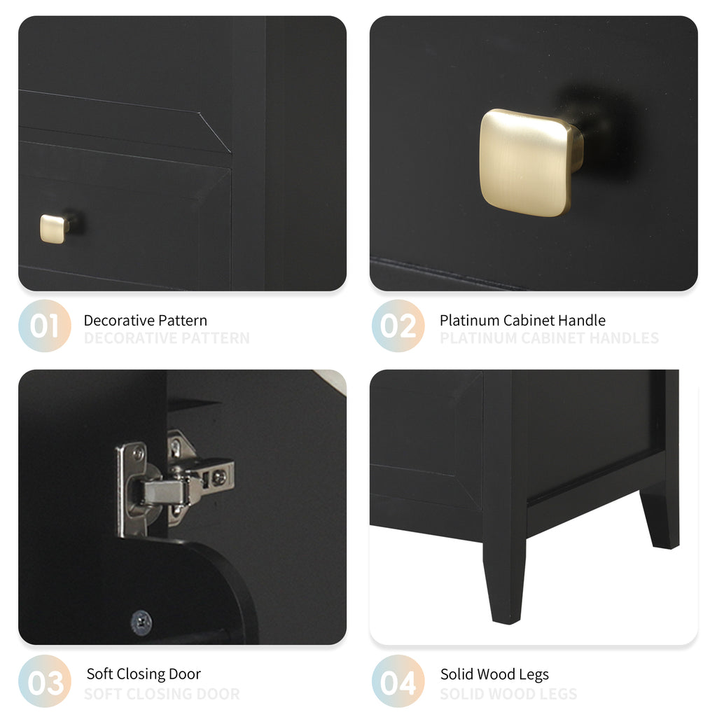 - Thoughtful Details: Considering the humid environment in the bathroom, the door hinges and handle are made of stainless steel, which is not easy to rust. In order to keep silent when open and closing the door, the soft closing door is selected for this cabinet. Platinum knobs on the door, creating a modern look that is smooth to the touch and pleasant to use.