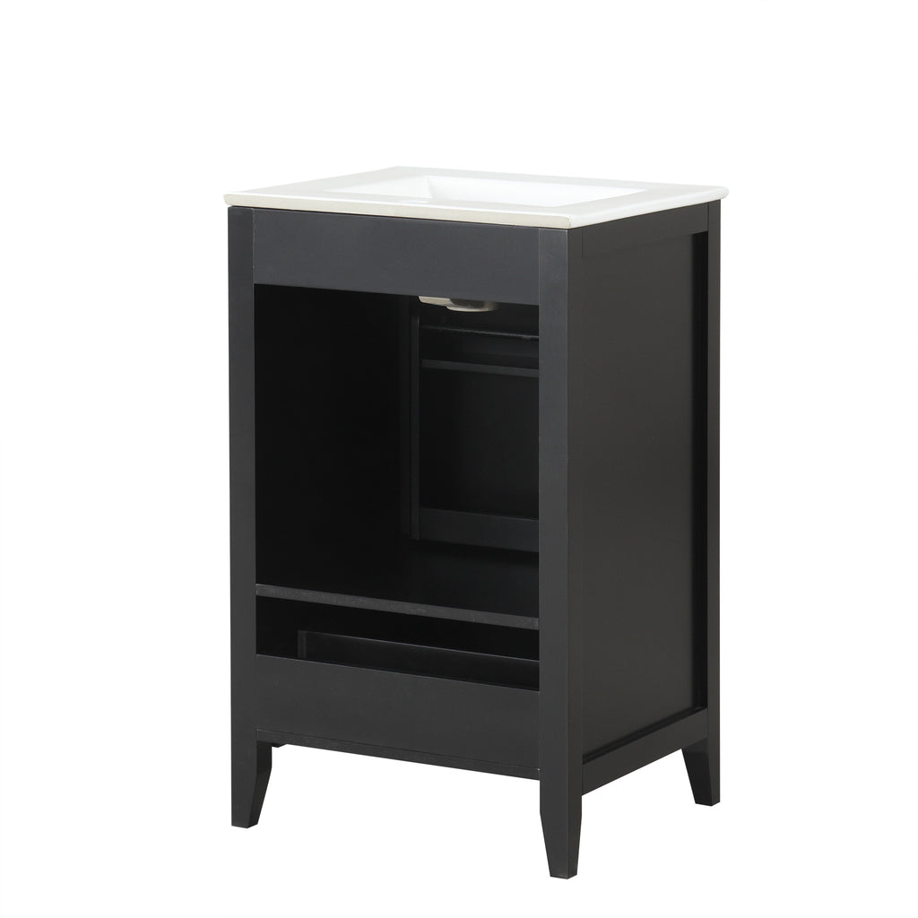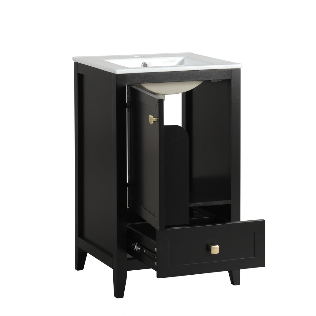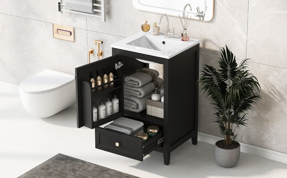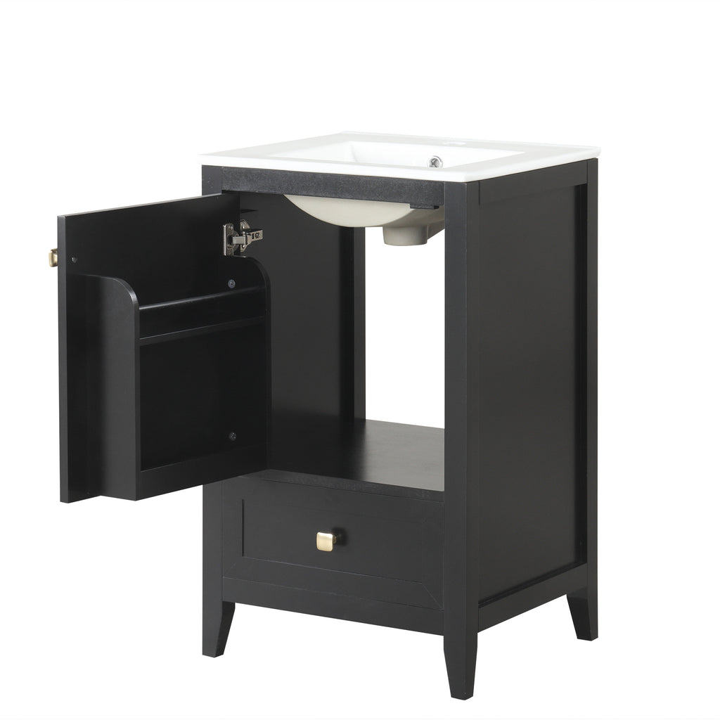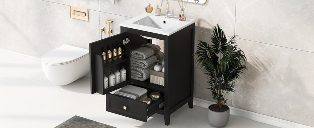 - Vanity with Cabinet & Storage Rack & Drawer - This bathroom vanity has ample storage space: one cabinet with door, two-tier storage rack on the door, and a big drawer. You can put soaps, towels, shampoos, tissue paper and other bathroom essentials in it so to keep them away from dust.