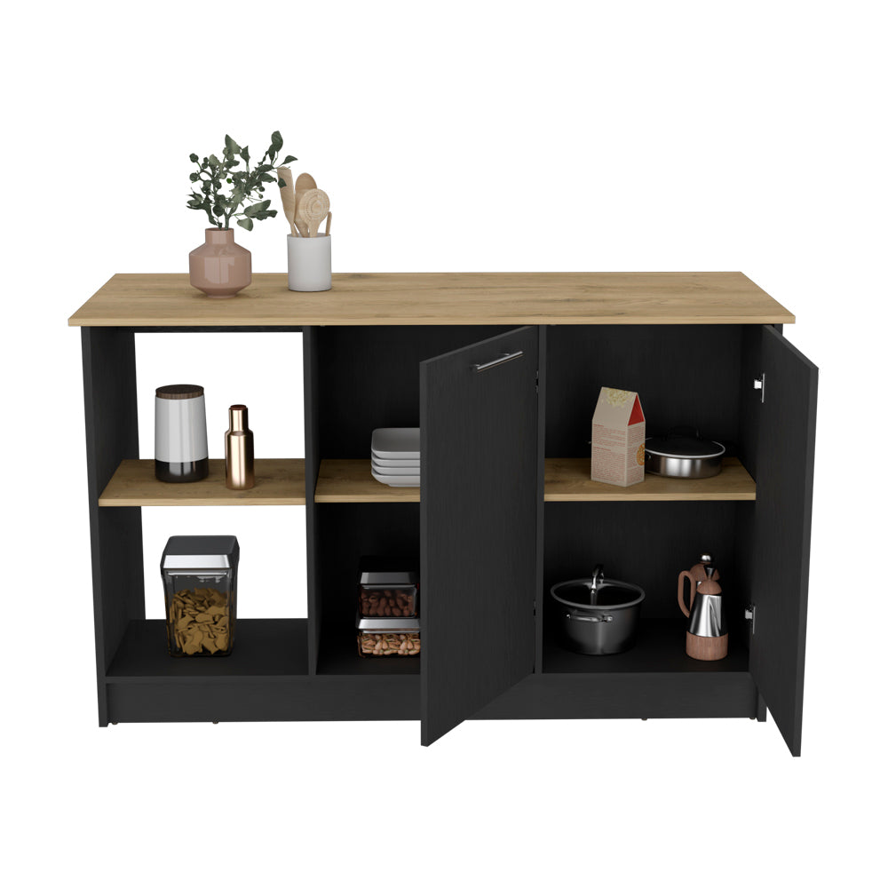 • Enclosed Storage: Double-door cabinet featuring inner shelves provides discreet storage for larger items and cookware.