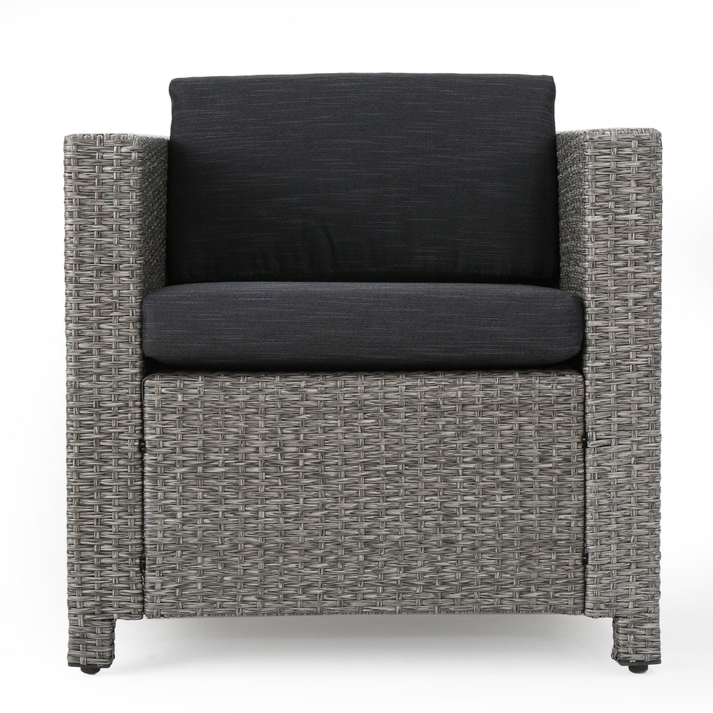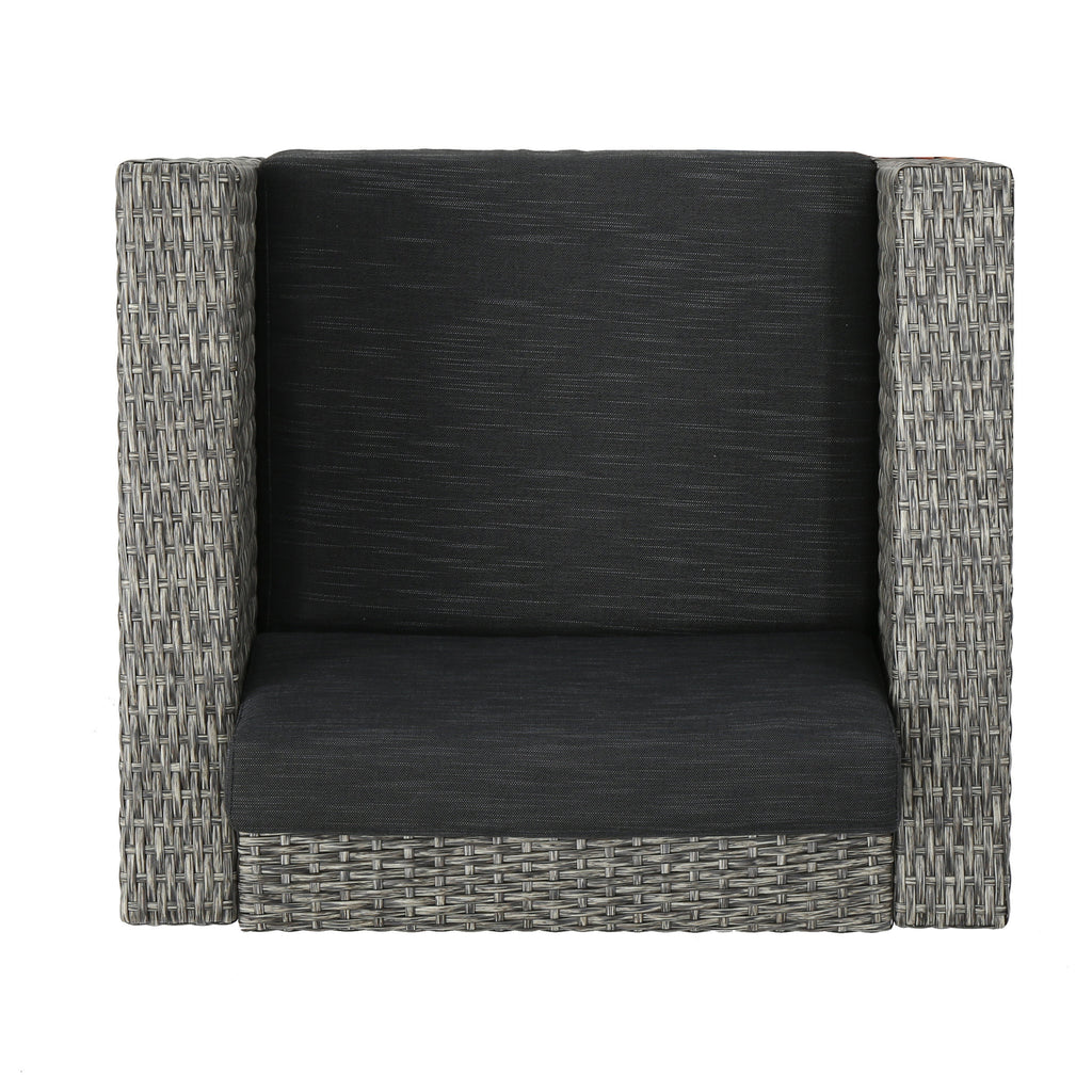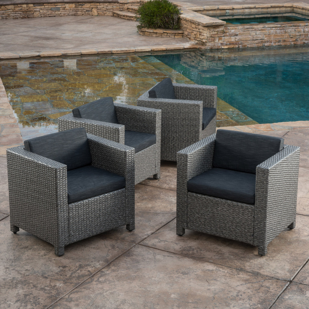 - These outdoor wicker club chairs are a fun addition to any outdoor space. The cushions are made with water resistant fabric and are extra padded for maximum comfort. These functional chairs are durable and will compliment any outdoor arrangement with a pop of color and style.