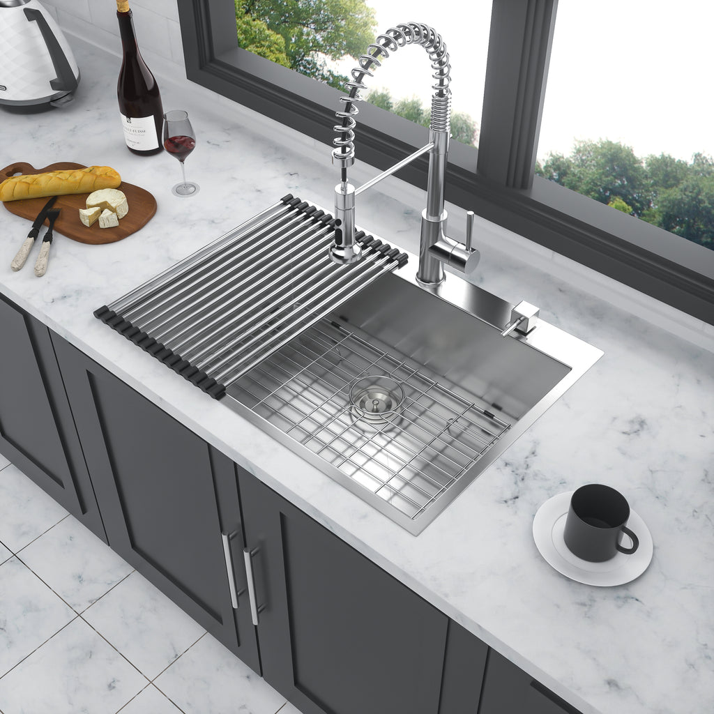 - Stainless Steel Drop-in Kitchen Sink Size and Package: 28' x 22' x 9' (minimum cabinet size: 31 inch). Package comes in a drop in topmount kitchen sink, drain assembly , bottom rinse grid and roll up rack,cutout template and installation introuction.